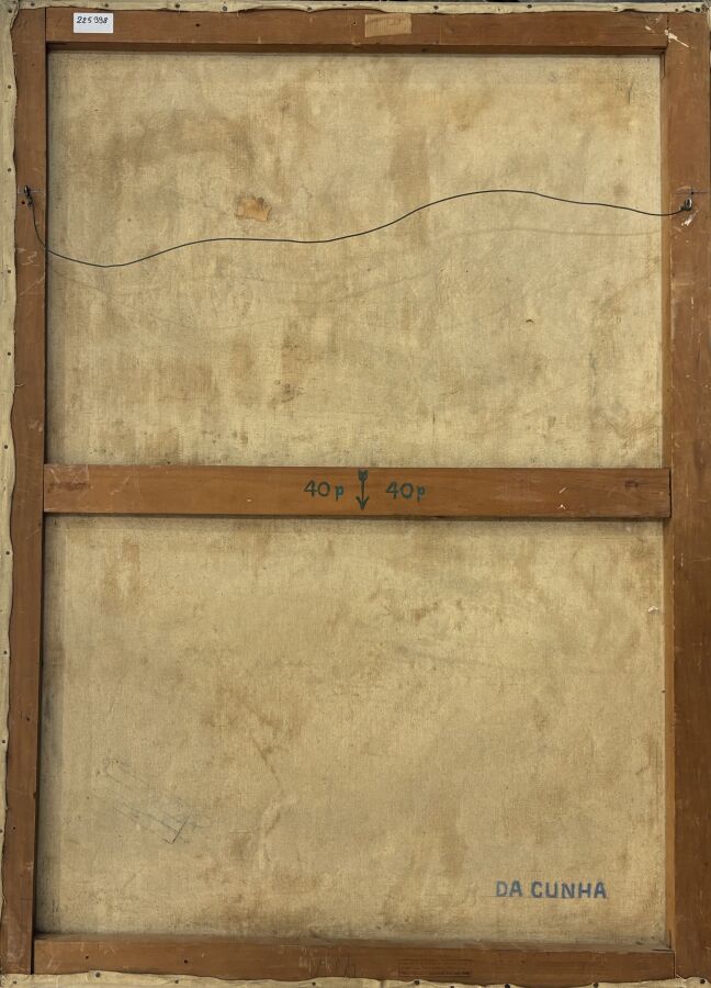 Carlos DA CUNHA (1907-?), "Composition" 1962, huile sur toile, signée et datée en bas à droite, tampon "Da Cunha" au dos de la toile, 100 x 72, 5 cm (quelques écaillures).