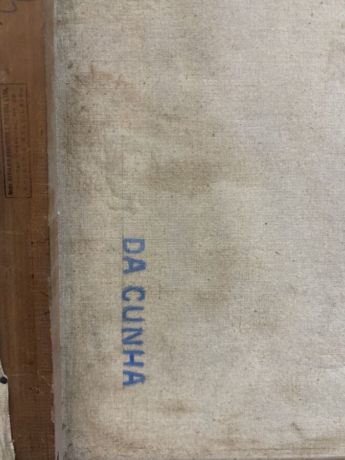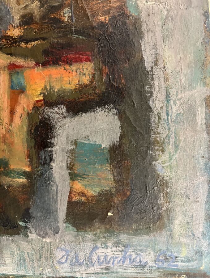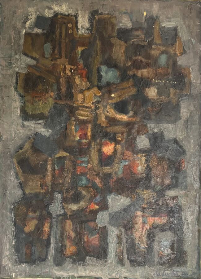 Carlos DA CUNHA (1907-?), "Composition" 1962, huile sur toile, signée et datée en bas à droite, tampon "Da Cunha" au dos de la toile, 100 x 72, 5 cm (quelques écaillures).