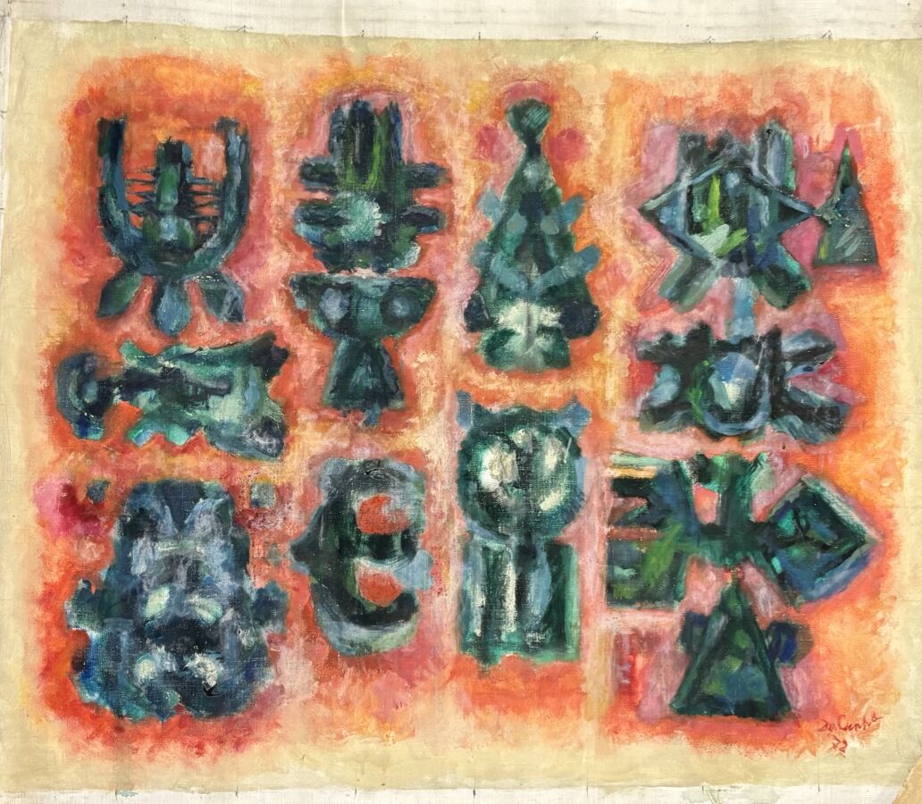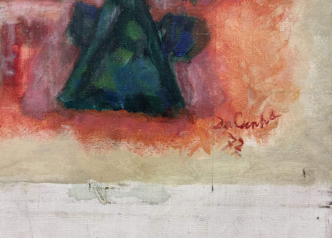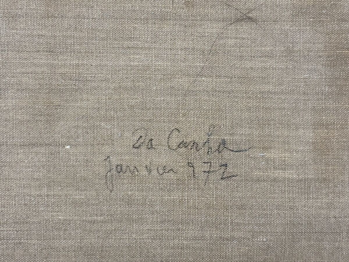 Carlos DA CUNHA (1907-?), "Composition" Janvier 1972, huile sur toile (roulée), signée et datée en bas à droite, contresignée au dos, 75, 5 x 87,5 cm (sans châssis).
