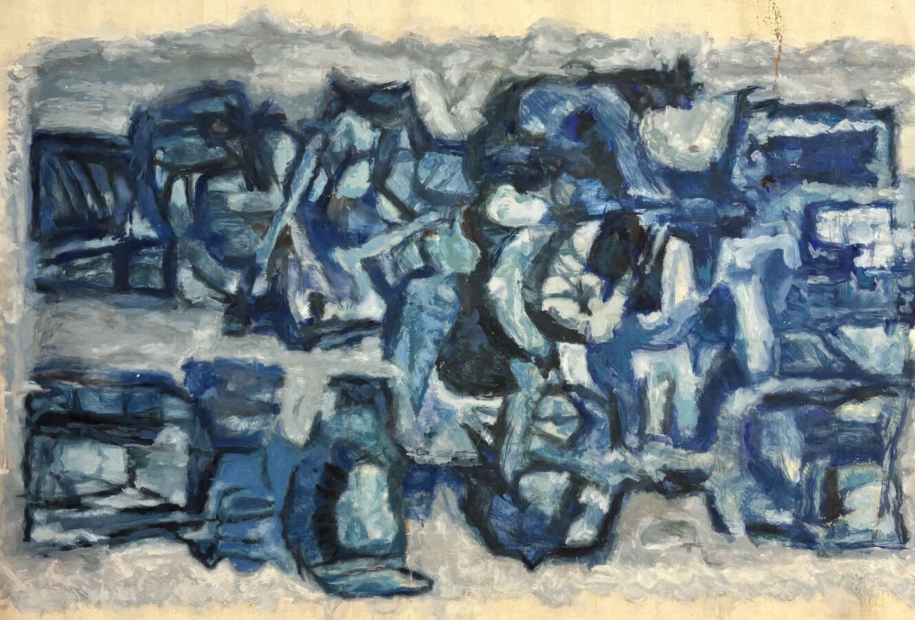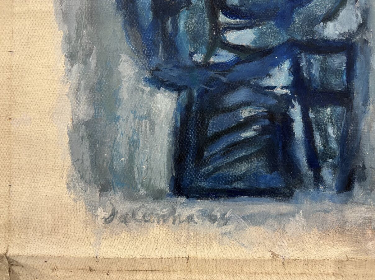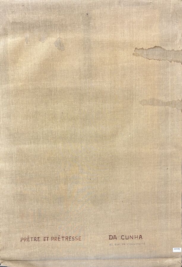 Carlos DA CUNHA (1907-?), "Prête et prêtresse" 1964, huile sur toile (roulée), signée en bas à gauche, contresignée et datée au revers, 125 x 87 cm (taches d'humidité, sans châssis).