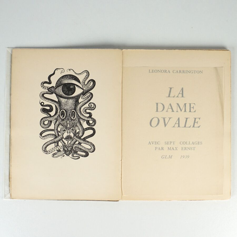 CARRINGTON (Leonora) & ERNST (Max). La Dame Ovale. Paris, G L M, 1939. In-8 broché, couv. imprimée. Édition originale illustrée de 8 collages de Max Ernst gravés hors texte (7 annoncés par erreur à la couverture). Restauration en tête du dos, qqs légères rousseurs à la couverture.