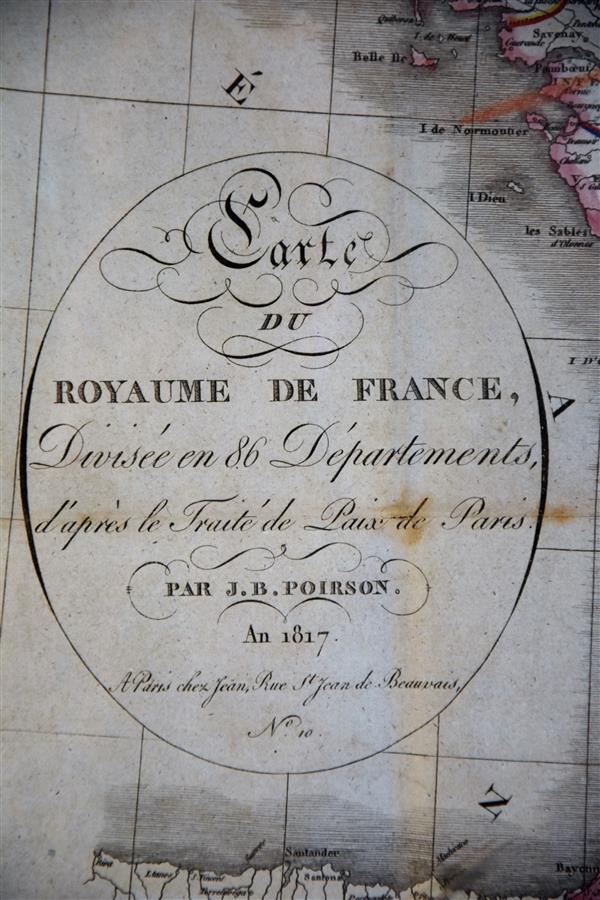 "Carte du Royaume de France divisé en 86 départements d'après le traité de paix de Paris J. B. Poirson, 1817", carte en couleurs, encadrée sous verre, 75 x 52 cm (une déchirure dans la planche, traces des pliures)