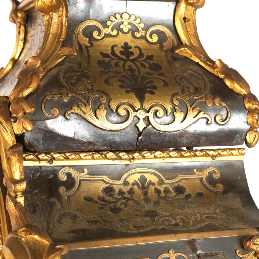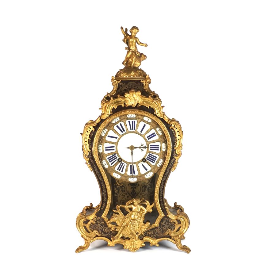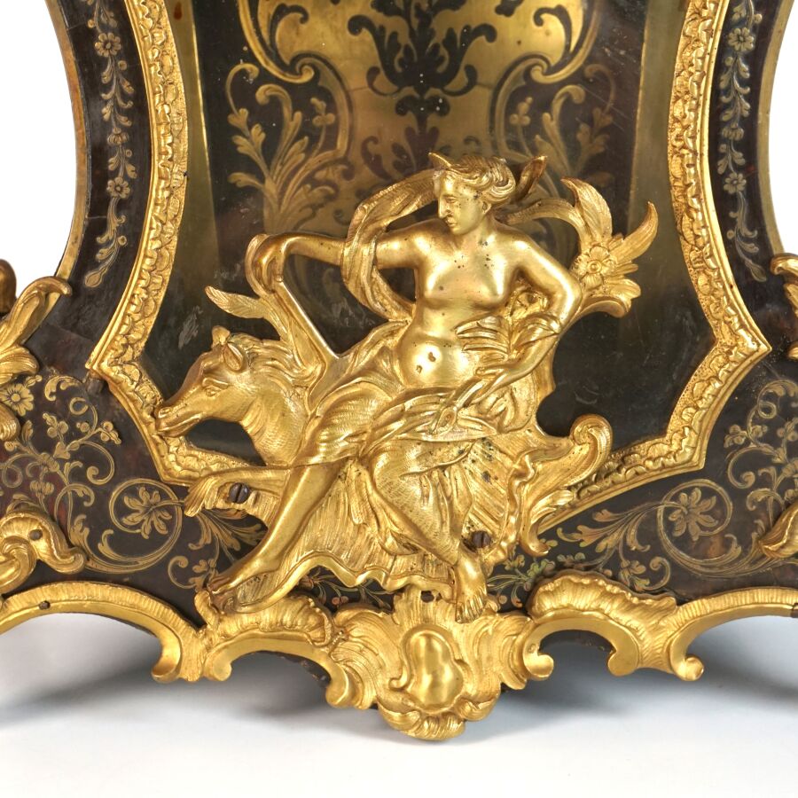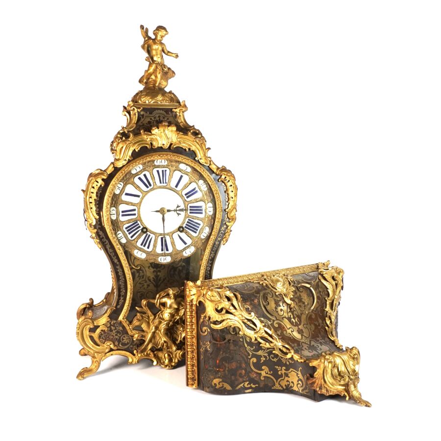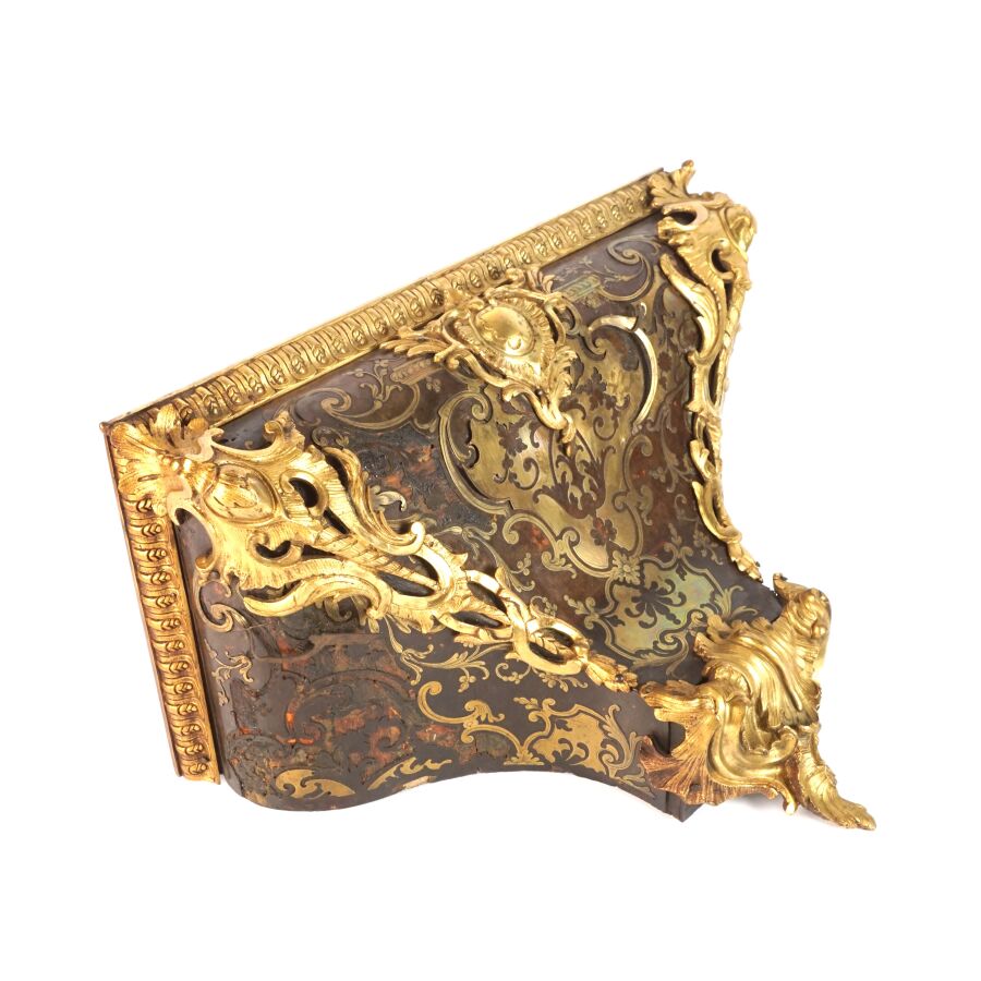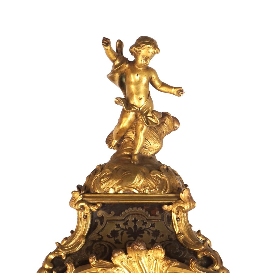 Cartel d'applique, âme en bois, marqueterie dite Boulle et ornementation de bronze doré, cadran circulaire, chiffres romains pour les heures émaillés en bleu présentés en cartouche émaillé blanc, l'amortissement surmonté d'un putto au drapé (manque une main), la partie basse ornée d'un bas-relief en applique figurant probablement "L'enlèvement d'Europe", présenté avec son support dit "cul de lampe" en marqueterie et bronze doré, H. 71 cm. L. 36 cm (manques à la marqueterie, usures et sauts, éclats au bois).