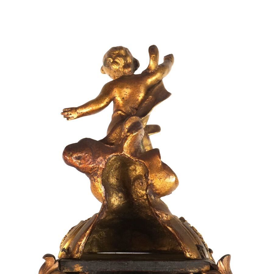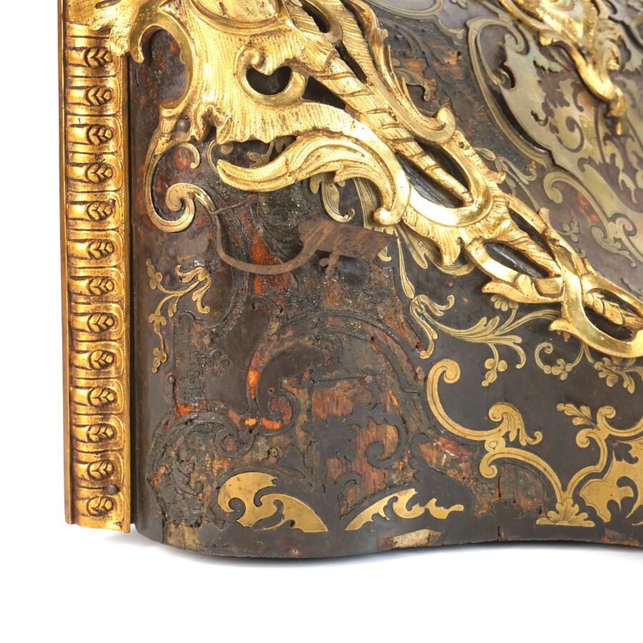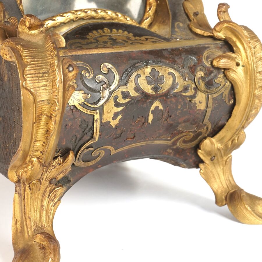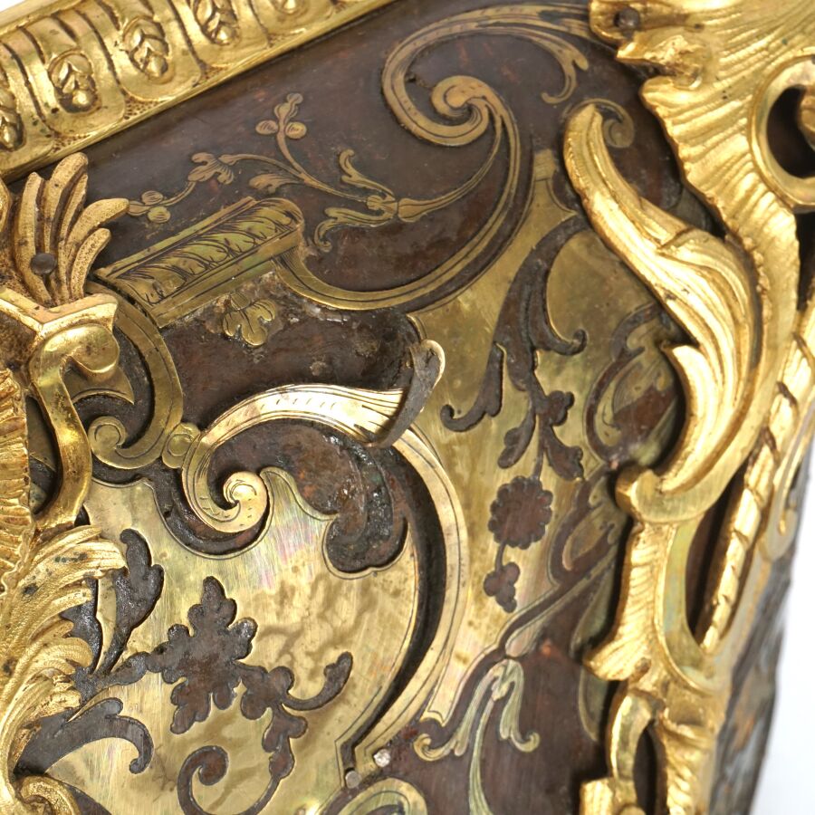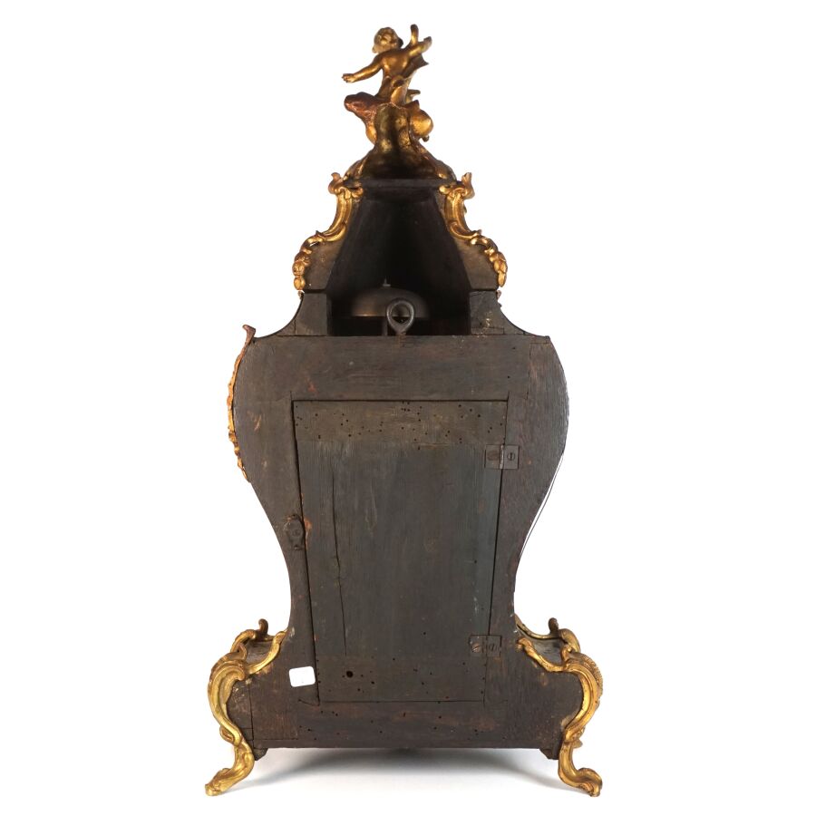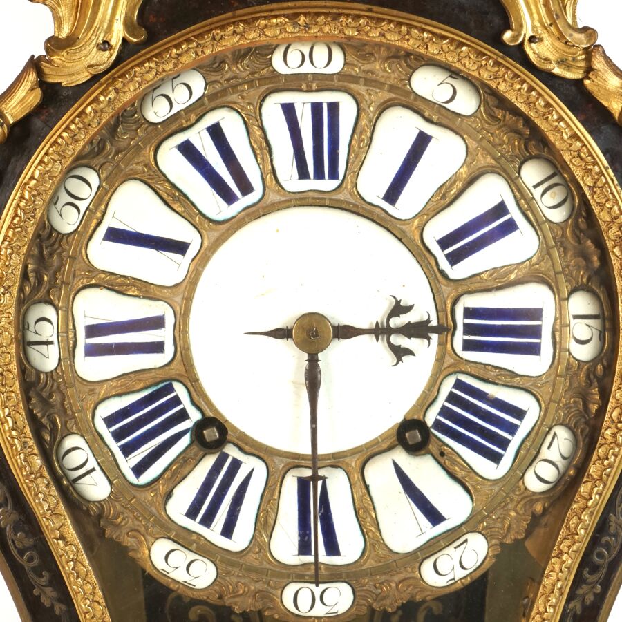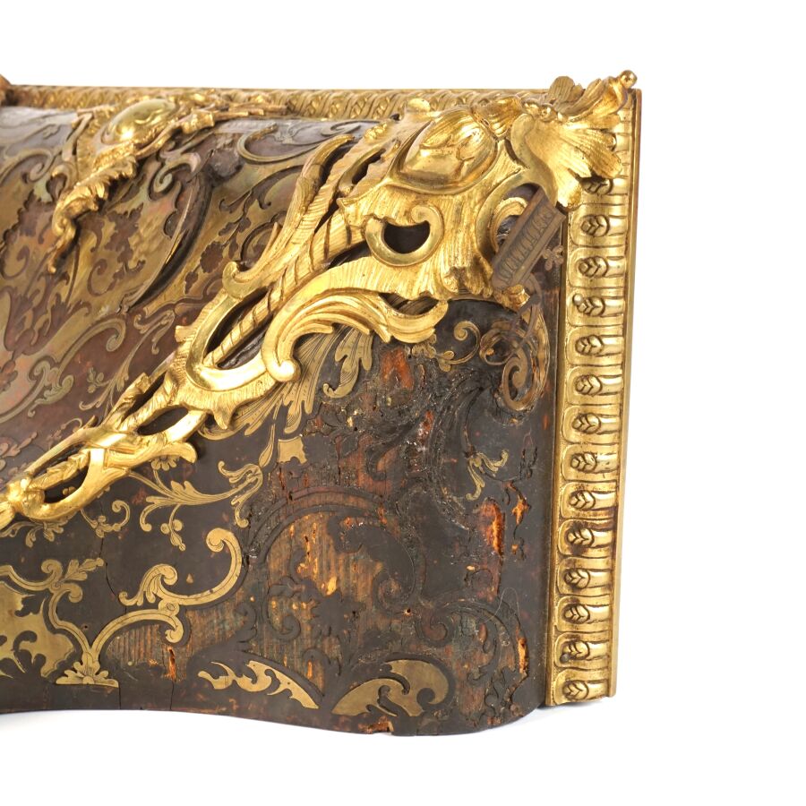 Cartel d'applique, âme en bois, marqueterie dite Boulle et ornementation de bronze doré, cadran circulaire, chiffres romains pour les heures émaillés en bleu présentés en cartouche émaillé blanc, l'amortissement surmonté d'un putto au drapé (manque une main), la partie basse ornée d'un bas-relief en applique figurant probablement "L'enlèvement d'Europe", présenté avec son support dit "cul de lampe" en marqueterie et bronze doré, H. 71 cm. L. 36 cm (manques à la marqueterie, usures et sauts, éclats au bois).