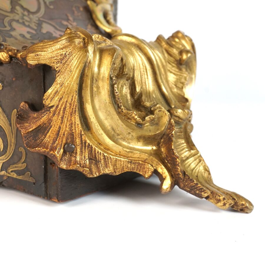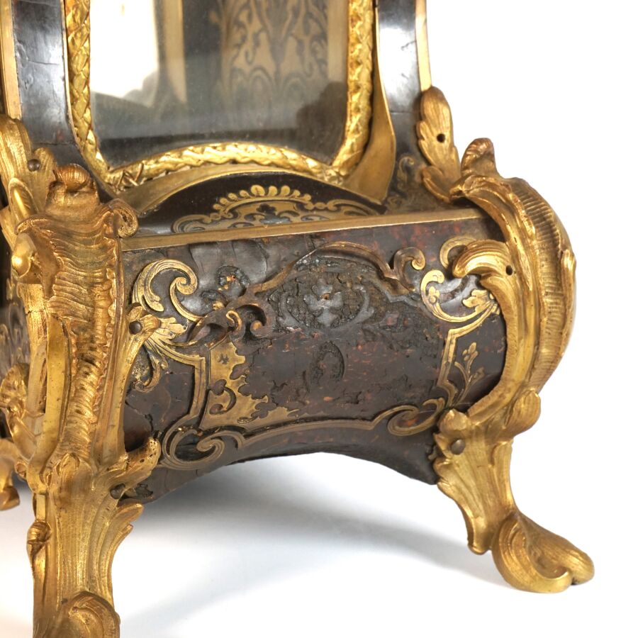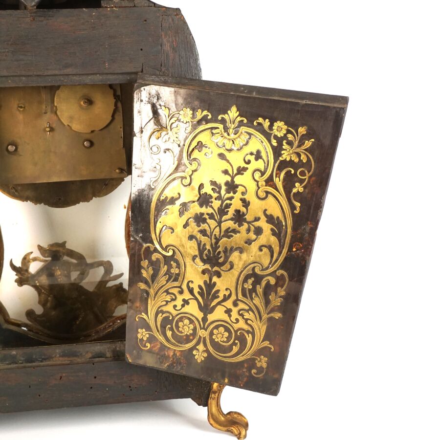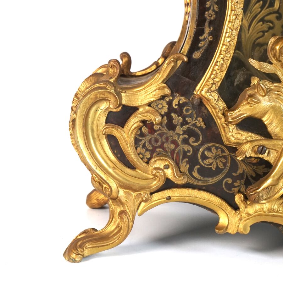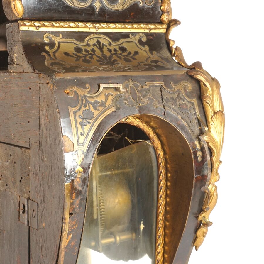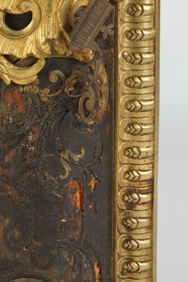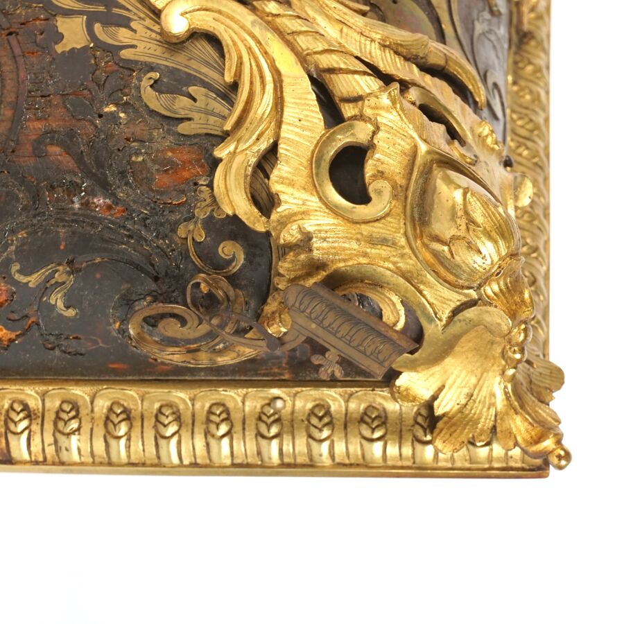 Cartel d'applique, âme en bois, marqueterie dite Boulle et ornementation de bronze doré, cadran circulaire, chiffres romains pour les heures émaillés en bleu présentés en cartouche émaillé blanc, l'amortissement surmonté d'un putto au drapé (manque une main), la partie basse ornée d'un bas-relief en applique figurant probablement "L'enlèvement d'Europe", présenté avec son support dit "cul de lampe" en marqueterie et bronze doré, H. 71 cm. L. 36 cm (manques à la marqueterie, usures et sauts, éclats au bois).