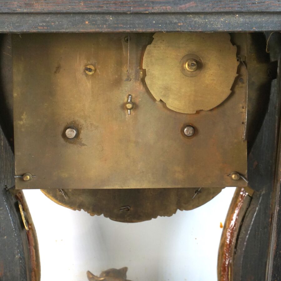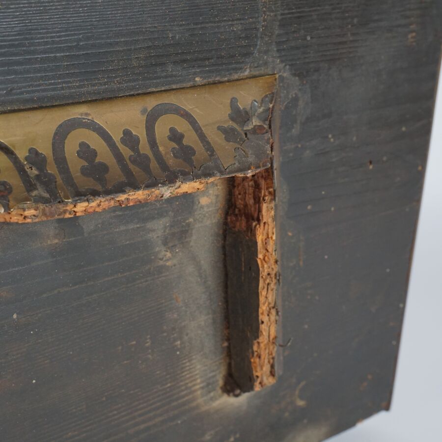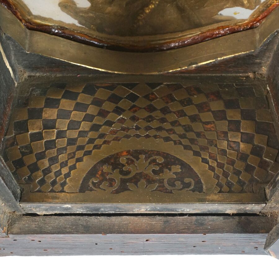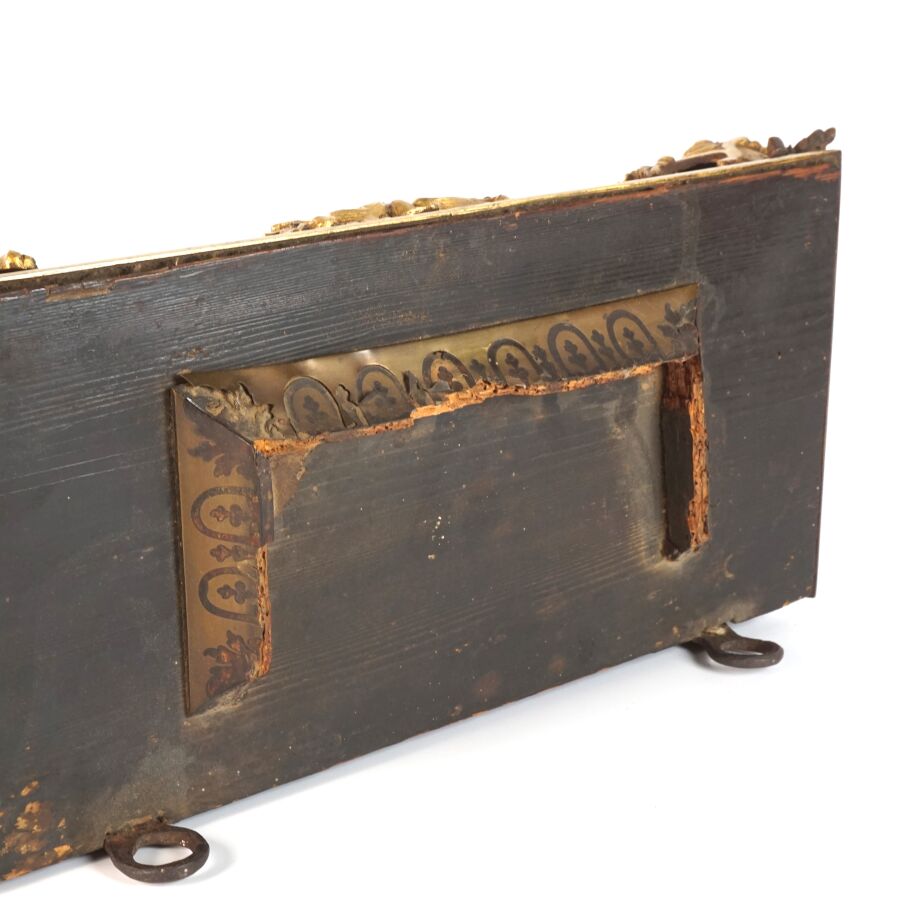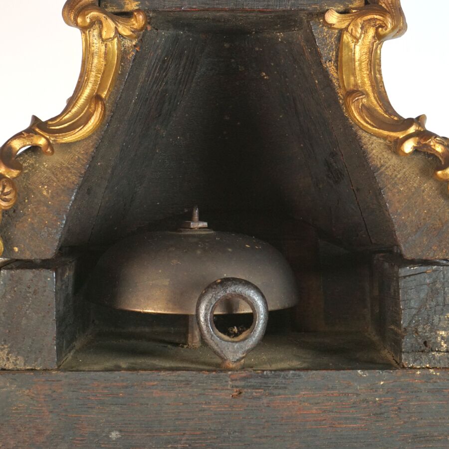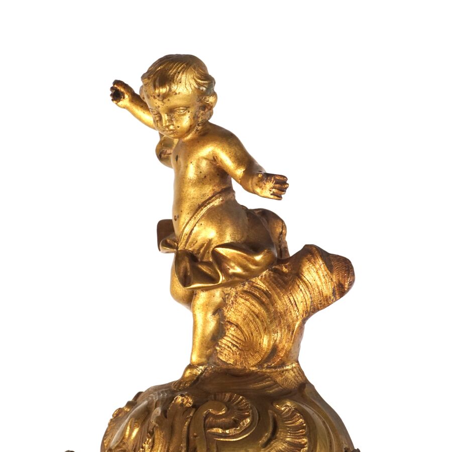 Cartel d'applique, âme en bois, marqueterie dite Boulle et ornementation de bronze doré, cadran circulaire, chiffres romains pour les heures émaillés en bleu présentés en cartouche émaillé blanc, l'amortissement surmonté d'un putto au drapé (manque une main), la partie basse ornée d'un bas-relief en applique figurant probablement "L'enlèvement d'Europe", présenté avec son support dit "cul de lampe" en marqueterie et bronze doré, H. 71 cm. L. 36 cm (manques à la marqueterie, usures et sauts, éclats au bois).