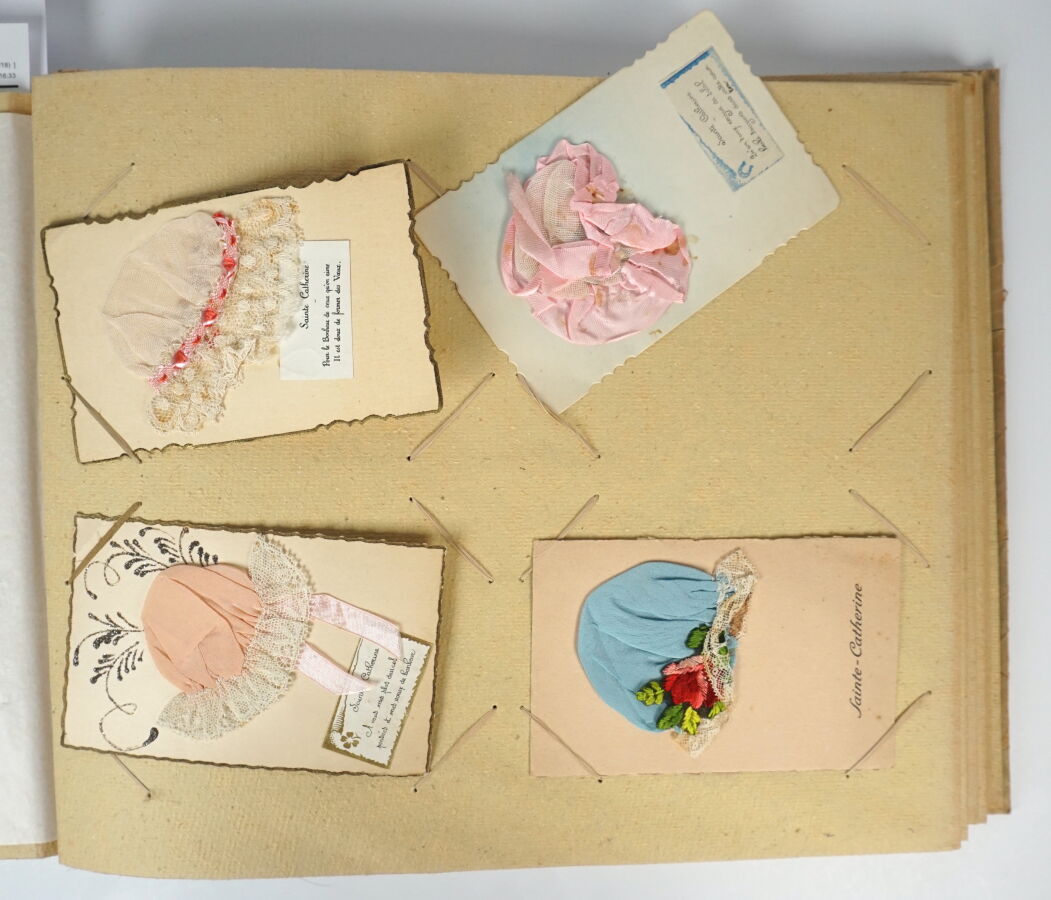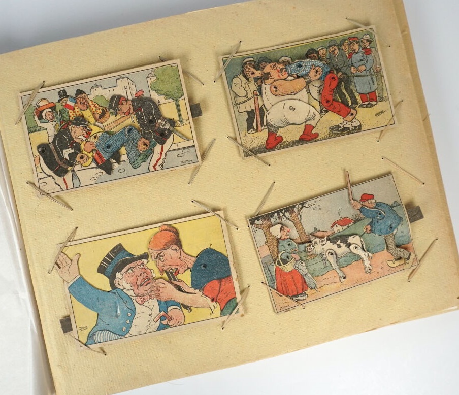 [CARTES POSTALES ANCIENNES] - Album d'environ 92 cartes postales et de découpis dont 9 cartes postales et 1 découpage humoristiques animés en couleurs et à tirettes de Zutna. Le restant de l'album est constitué de cartes postales fantaisies : Sainte Catherine, scènes familiales, scènes romantiques, scènes de l'armée, agence matrimoniale de Limenay, … sous album grand In-4° oblong.