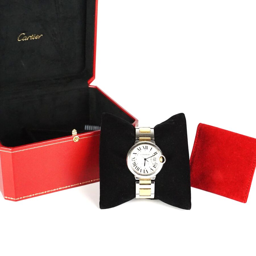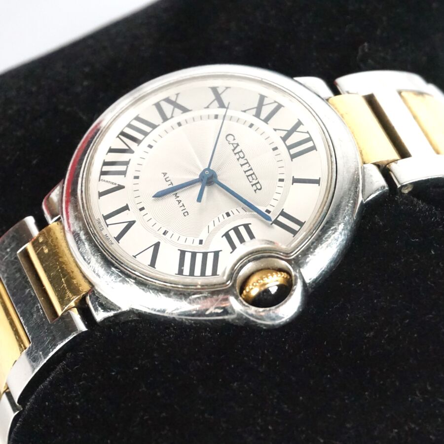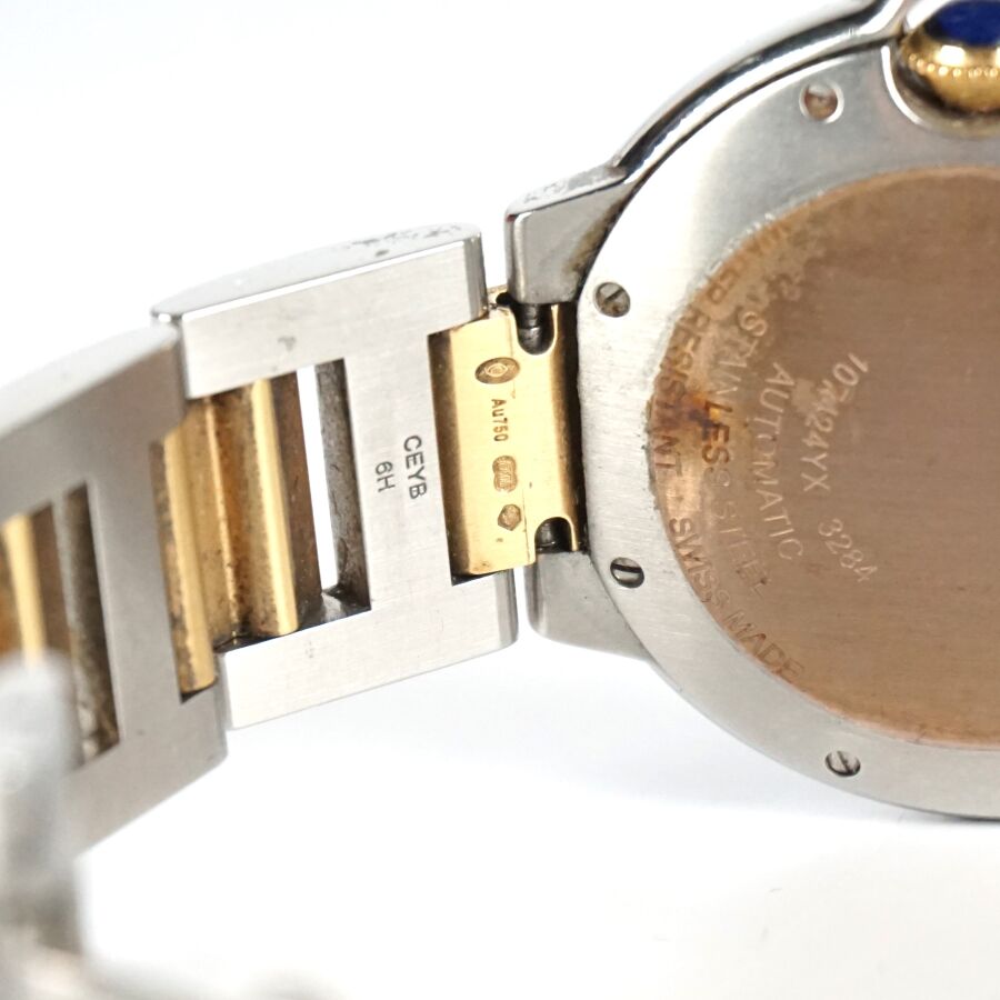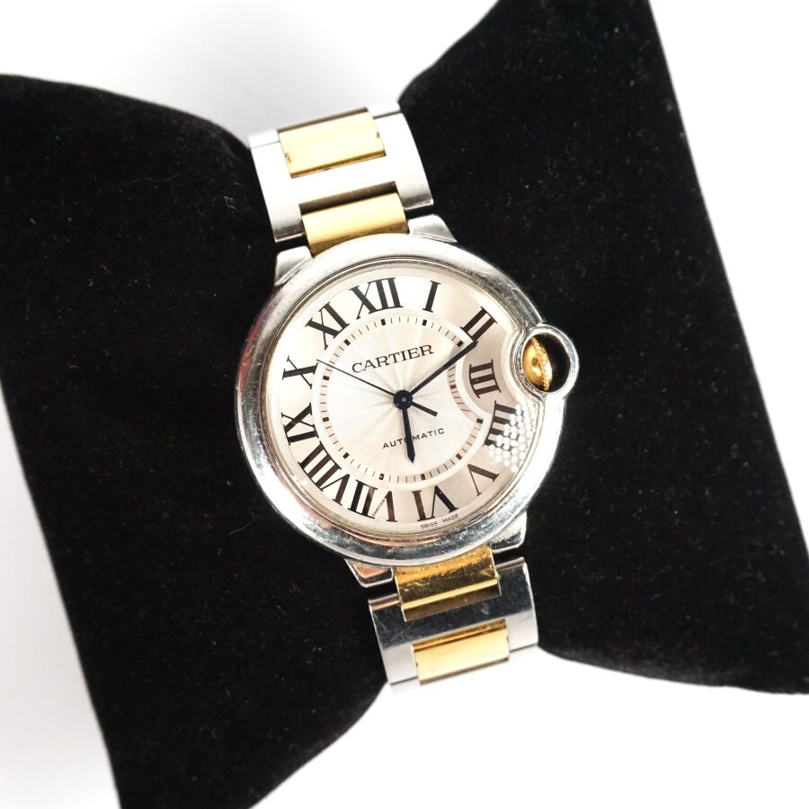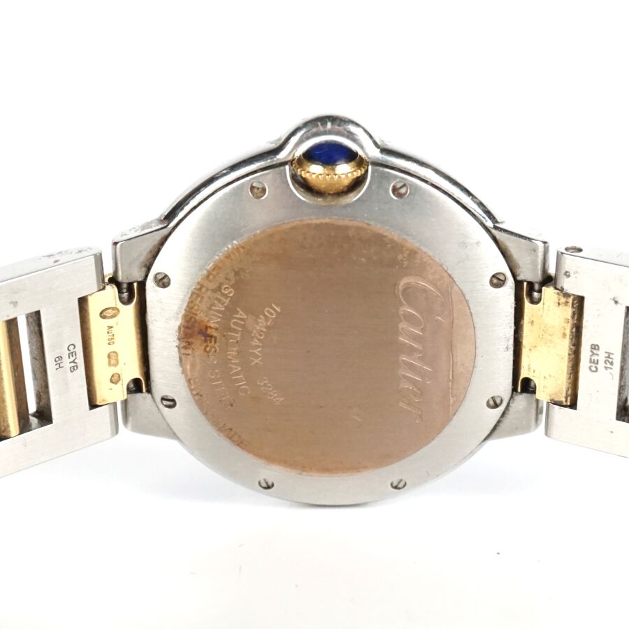 CARTIER : "Ballon bleu", Montre bracelet 36 mm, acier et or jaune 18K (750/oo), boîtier rond en acier, couronne crantée en or jaune (18K (750/oo), cadran guilloché argenté signé, chiffres romains pour les heures, aiguilles épées de couleur bleue, fond à vis signé et numéroté 107424YX - 3284, réf. CRW2BB0012, mouvement automatique, bracelet articulé, boucle déployante logotée, présentée dans son écrin d'origine, avec deux pochettes en feutre rouge et beige logotées et un maillon supplémentaire (petites rayures d'usage).