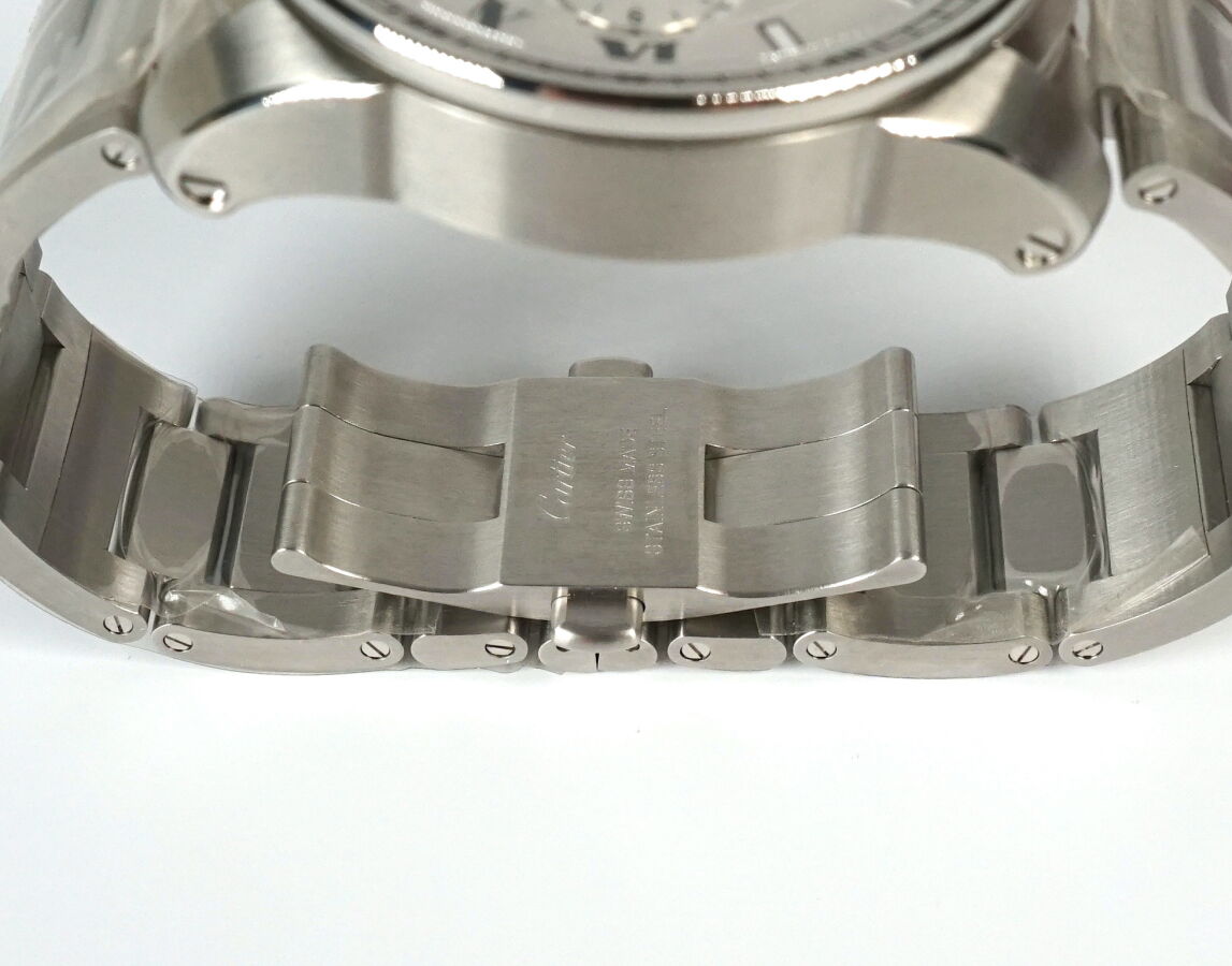 CARTIER : Montre d'homme en acier, modèle "Calibre", Ref. W7100045, boîtier rond 42 mm, water resistant, cadran argenté à décor guilloché, chiffres romains et index, petite seconde, chronographe, guichet dateur à 6h, remontoir serti d'une pierre bleue, fond transparent signé et numéroté 156466TX, bracelet articulé, boucle déployante signée.