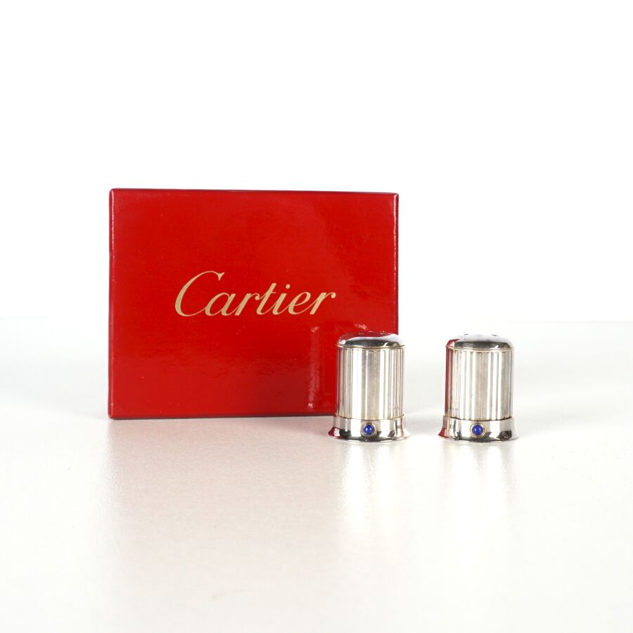 CARTIER : Paire de salières en métal argenté et cabochons bleus imitant le saphir, signées et datées 1990 dessous, présentée en coffret d'origine, H. 3 cm.