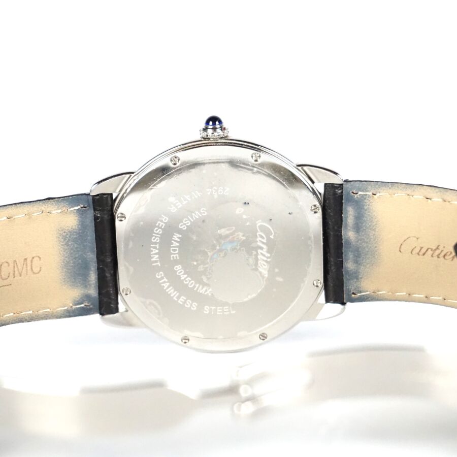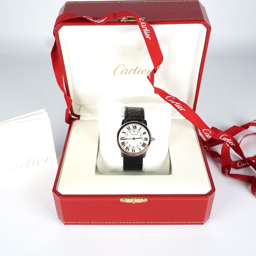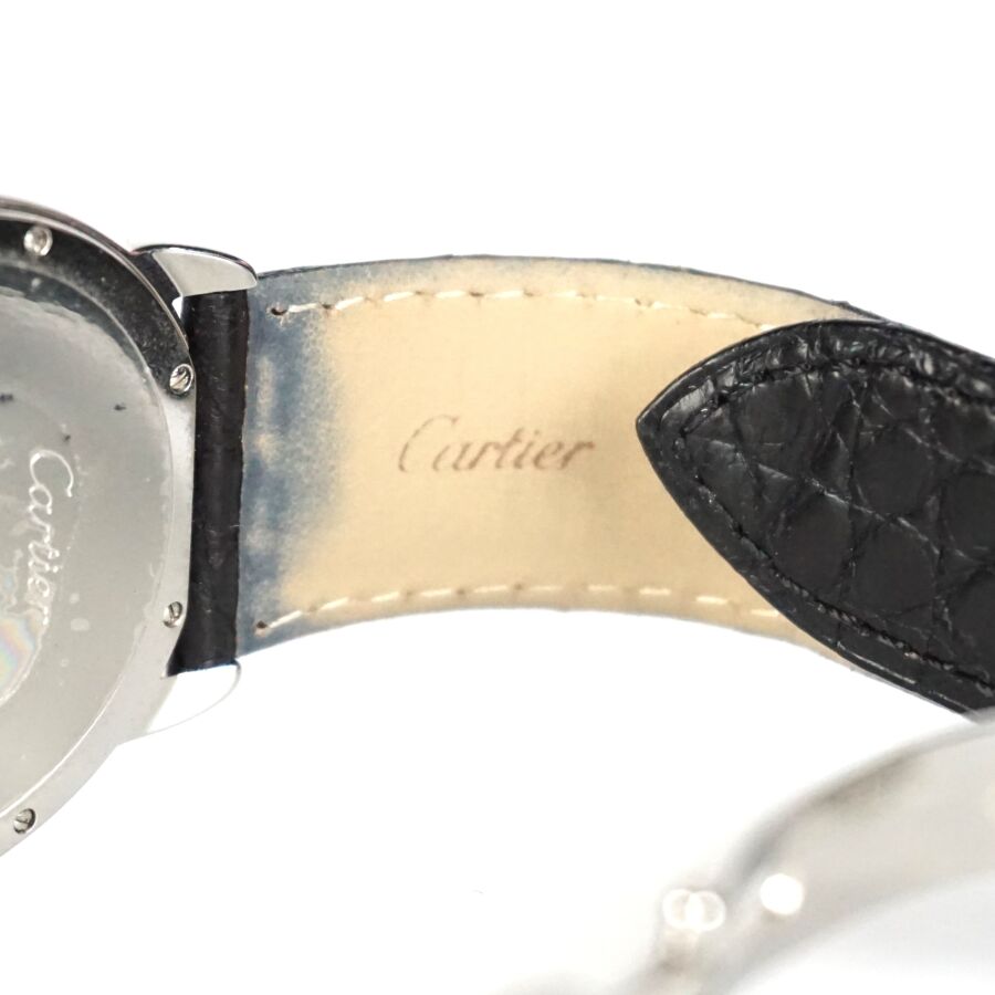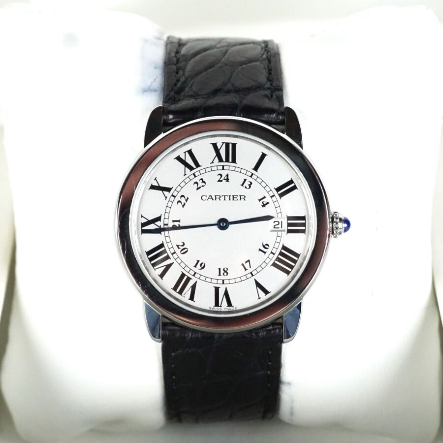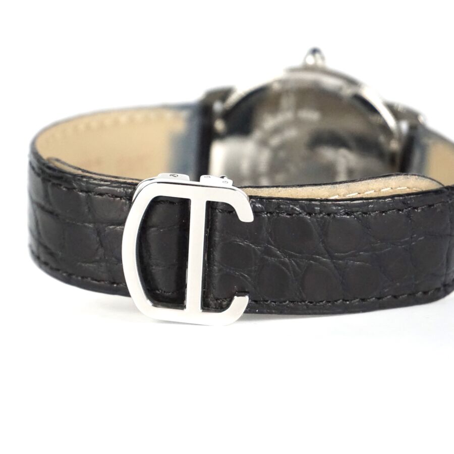 CARTIER : "Ronde Solo", montre bracelet, boîtier plat et rond en acier chromé, cadran nacré et signé, chiffres romains et arabes pour les heures, minuterie chemin de fer, guichet dateur à 3H, couronne crantée sertie d'un saphir cabochon bleu, fond à vis signé et numéroté, bracelet en cuir noir effet crocodile et boucle déployante logotée, mouvement à quartz, présentée dans son écrin d'origine, Diam. Boîtier : 8.5 cm.