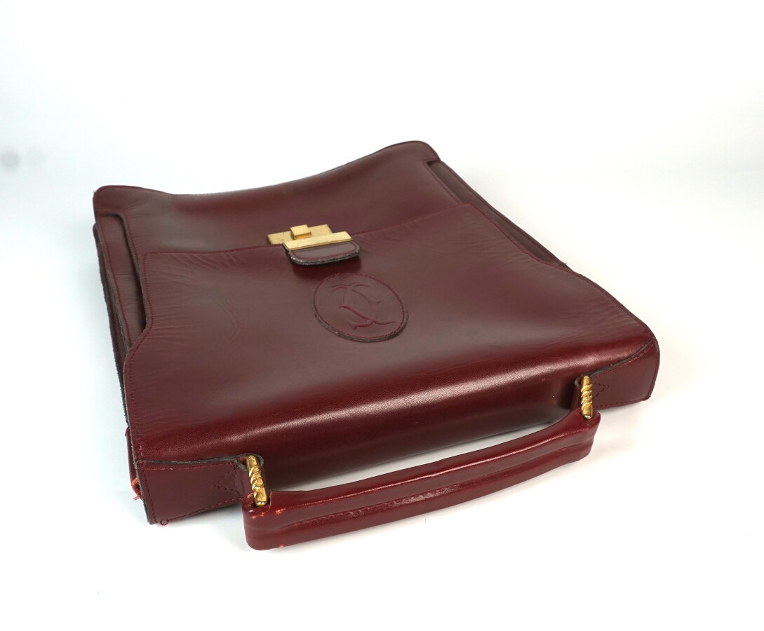 CARTIER : Sacoche à main pour homme, en cuir bordeaux, 4 compartiments intérieurs dont un zippé, L. 22 cm, H. totale : 30 cm (légères usures).