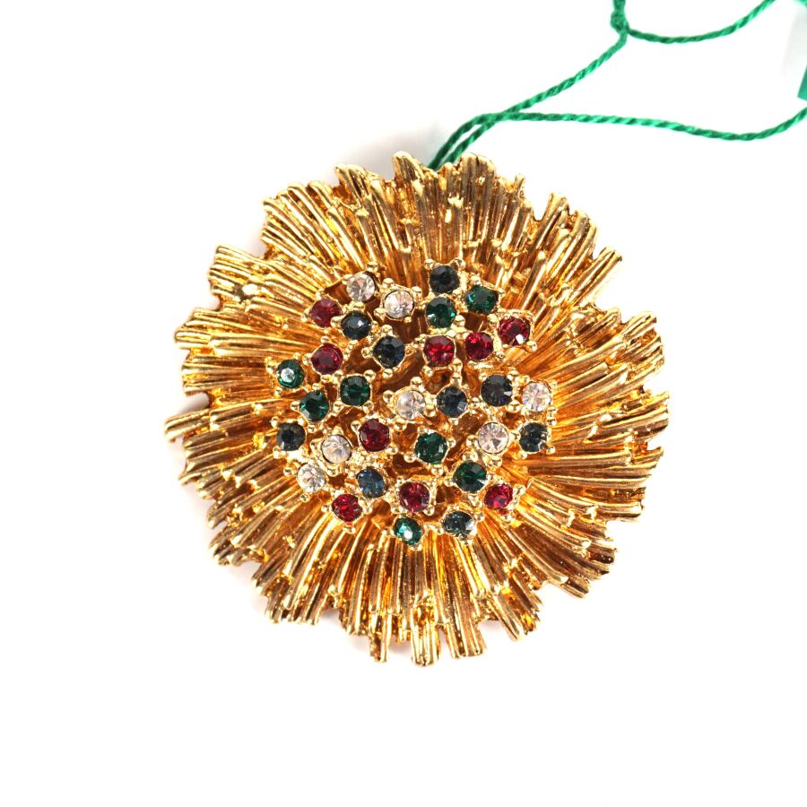 CARVEN : Broche "Fleur" en métal doré, les pistils ornés de verroterie polychrome et strass, signée au revers, Diam. 4.5 cm.