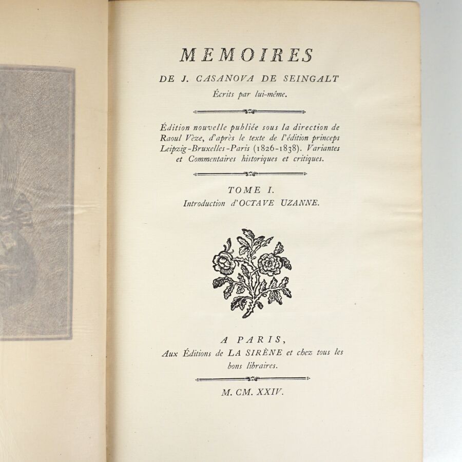 CASANOVA (Giaccomo Girolamo). Mémoires de J. Casanova de Seingalt. Édition nouvelle publiée sous la direction de Raoul Vèze d'après le texte de l'édition princeps Leipzig-Bruxelles-Paris (1826-1838). Paris, Éditions de la Sirène, 1924-1931. 12 vol. grand in-8 demi-chagrin brun, dos lisse orné, tête dorée. Une coiffe arrachée en queue du vol. VII, nombreux frottés aux dos et sur les mors (certains fragilisés).