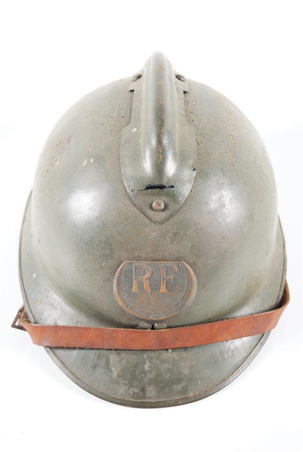 CASQUE ADRIAN MODELE 1926 POUR LES TROUPES D'AFRIQUE, insigne modèle 1915, peinture d'origine en bel état, coiffe intérieure probablement postérieure en cuir, jugulaire en cuir fauve, remontage probable, ABE.