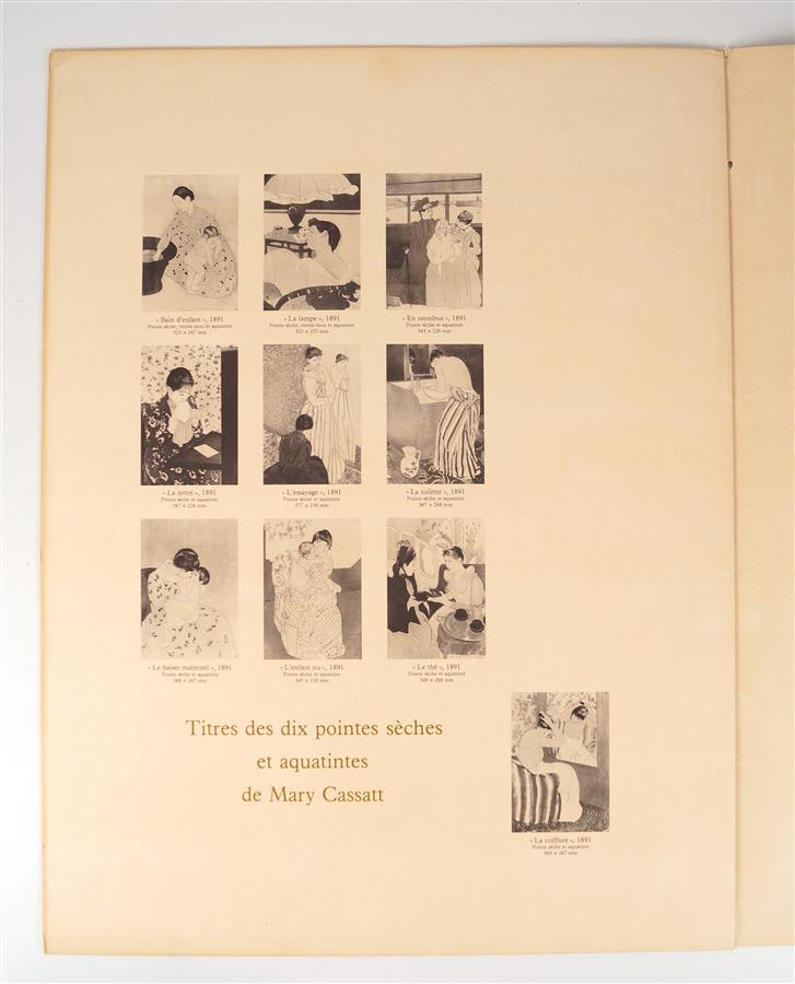 CASSATT (Mary) - Pointes-sèches - Sans lieu ; Bibliothèque Nationale et Claude Tchou & Sons, 1991 - Suite de 9 pointes-sèches et aquatintes en couleurs (sur 10 annoncées), In-Folio, monogrammées et timbrées à sec, sous passe-partout, le tout sous 1 coffret en bois au 1er plat vitré pouvant s'accrocher au mur - Texte par Martine Mauvieux - Tirage numéroté sur vergé d'Arches (n°A103 sur 200 tirage total français : 250) - Bon état.