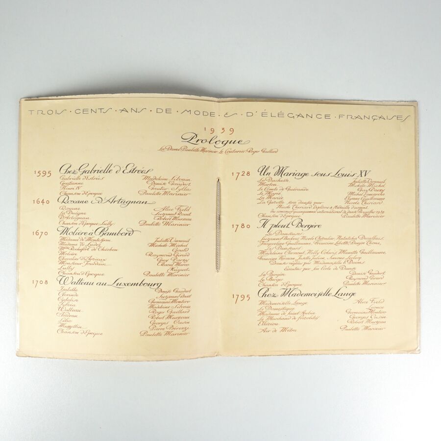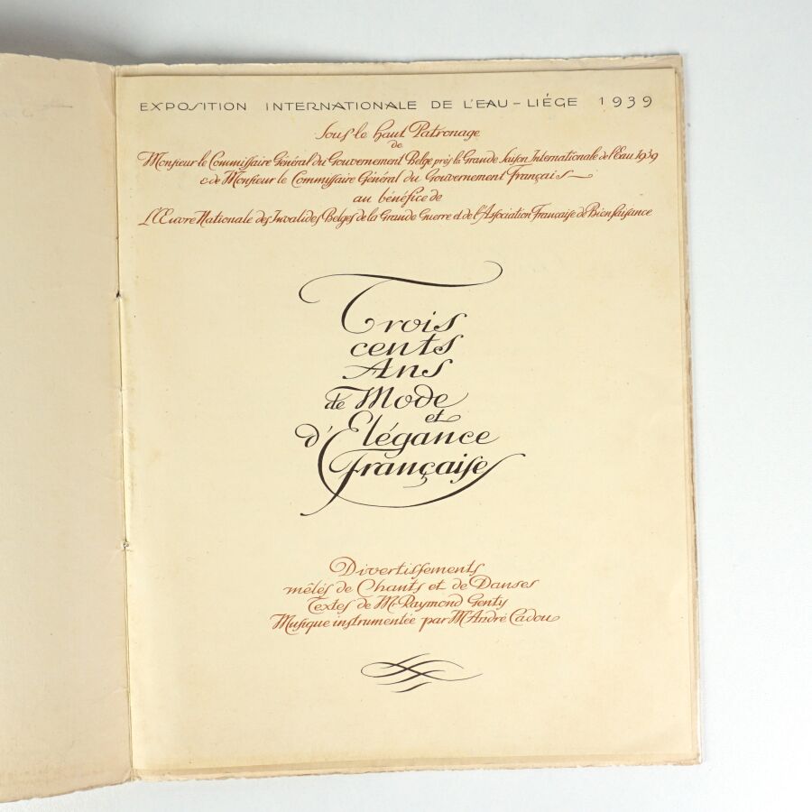 - Trois cents ans de mode et d'élégance française. Divertissements mêlés de chants et de danses, textes de Mr Raymond Genty, musique instrumentée par Mr André Cadou. Exposition internationale de l'eau, Liège 1939. Programme et menu de cet évènement organisé dans les palais de la France le 12 juin 1939.