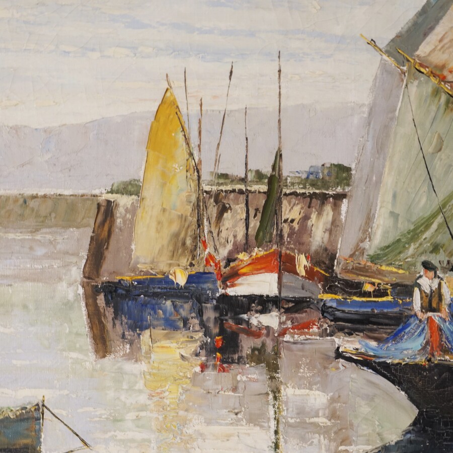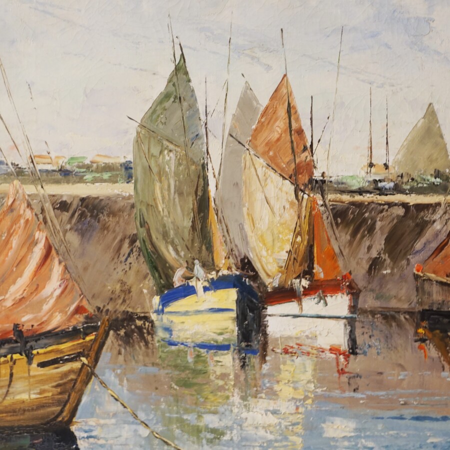 CATELEIN (XXe), "Voiles naviguant", huile sur toile porte une signature en bas à gauche, 79 x 160 cm.