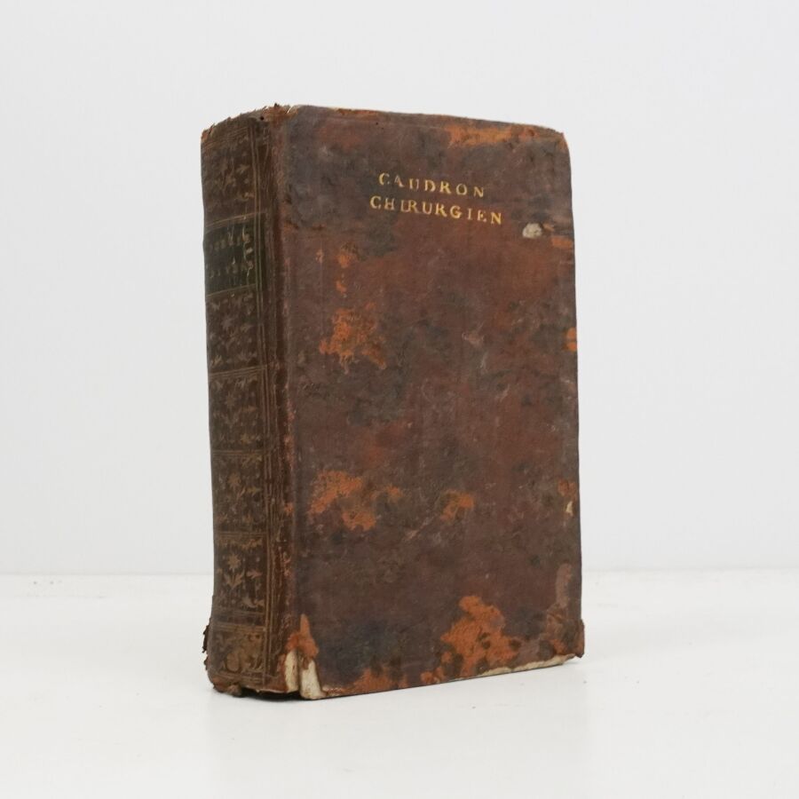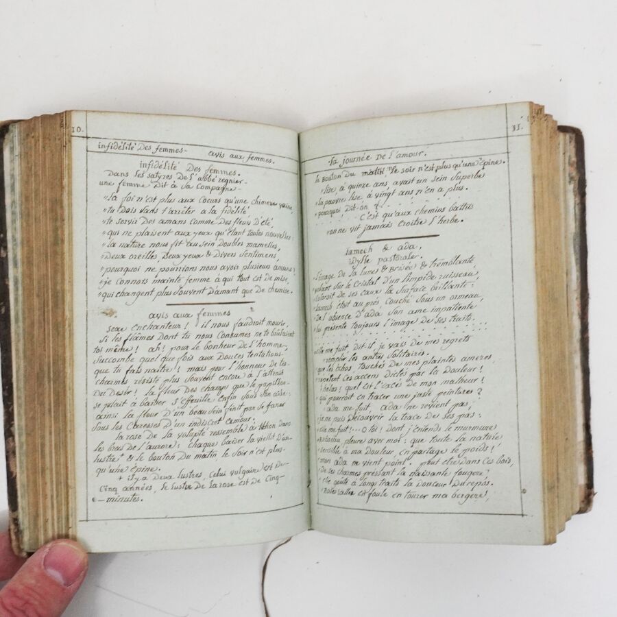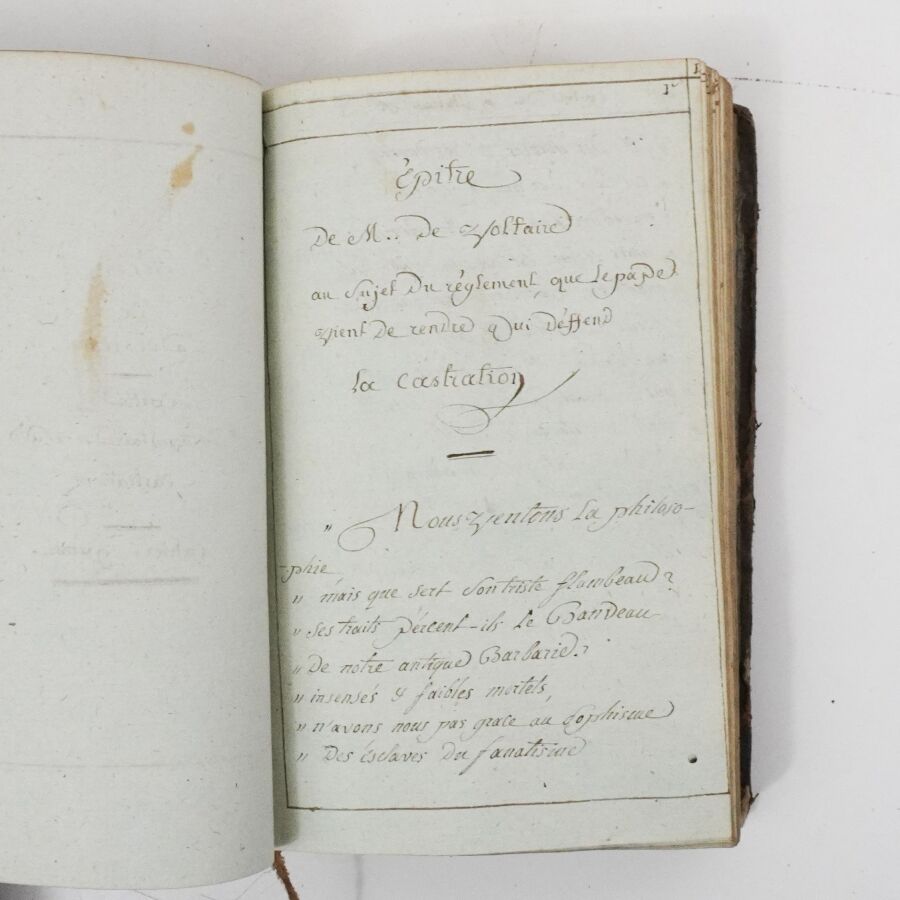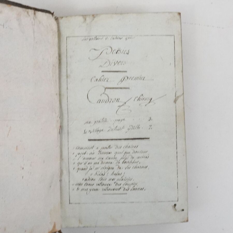 CAUDRON (Chirurgien). Poësies divers [sic]. sl, , sd (18e siècle). In-12 de 47-15-16-12-14-30-[2]-14-[2]-12-[4]-12-[4]-12-[4]-14-[2]-14-[2]-12-[4]-12-[4]-12-[4]-12-[4]-12-[2]-[16]-[2]-14-[2]-22-[2]-32-28-[4]-28-[4]-28-[4]-30-[2]-30-[2]-32-[4]-28-[4]-[30]-[2]-[28] pp. Veau marbré, dos lisse orné, superlibris doré "Caudron Chirurgien" (reliure de l'époque). Epidermures et manques de cuir. Recueil de nombreuses pièces manuscrites en hommage à Voltaire.
