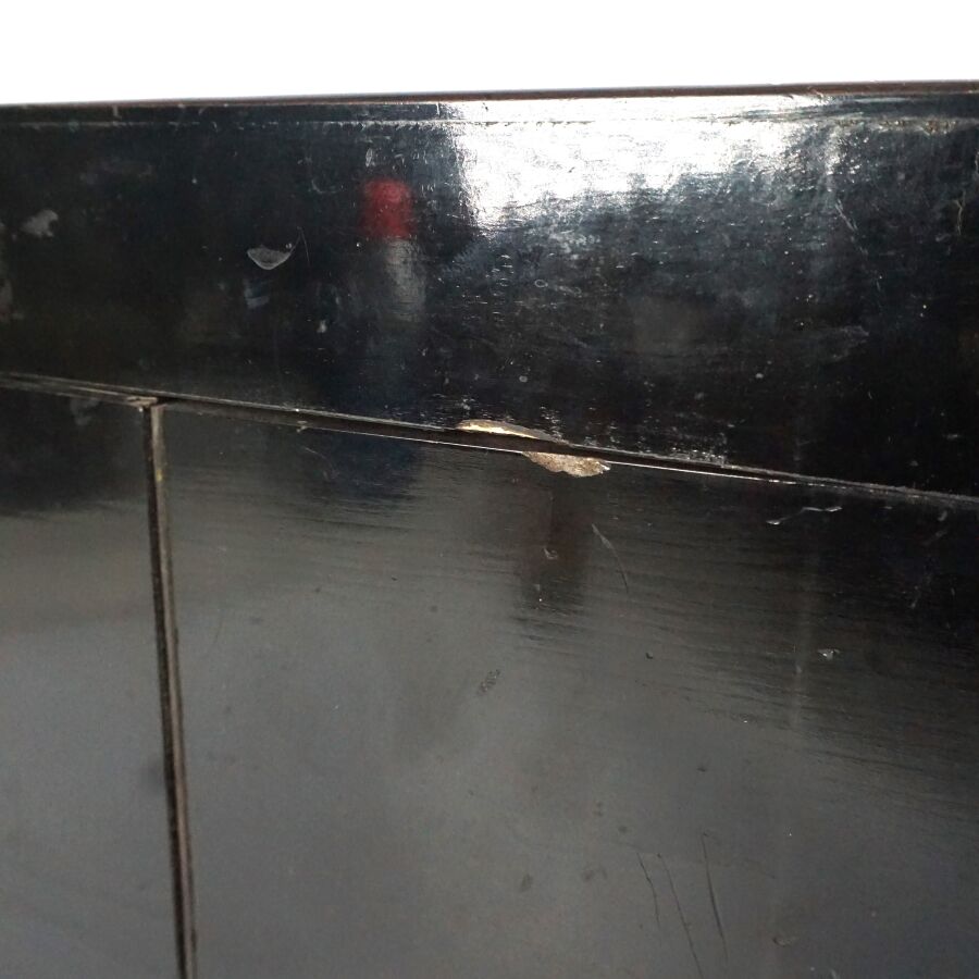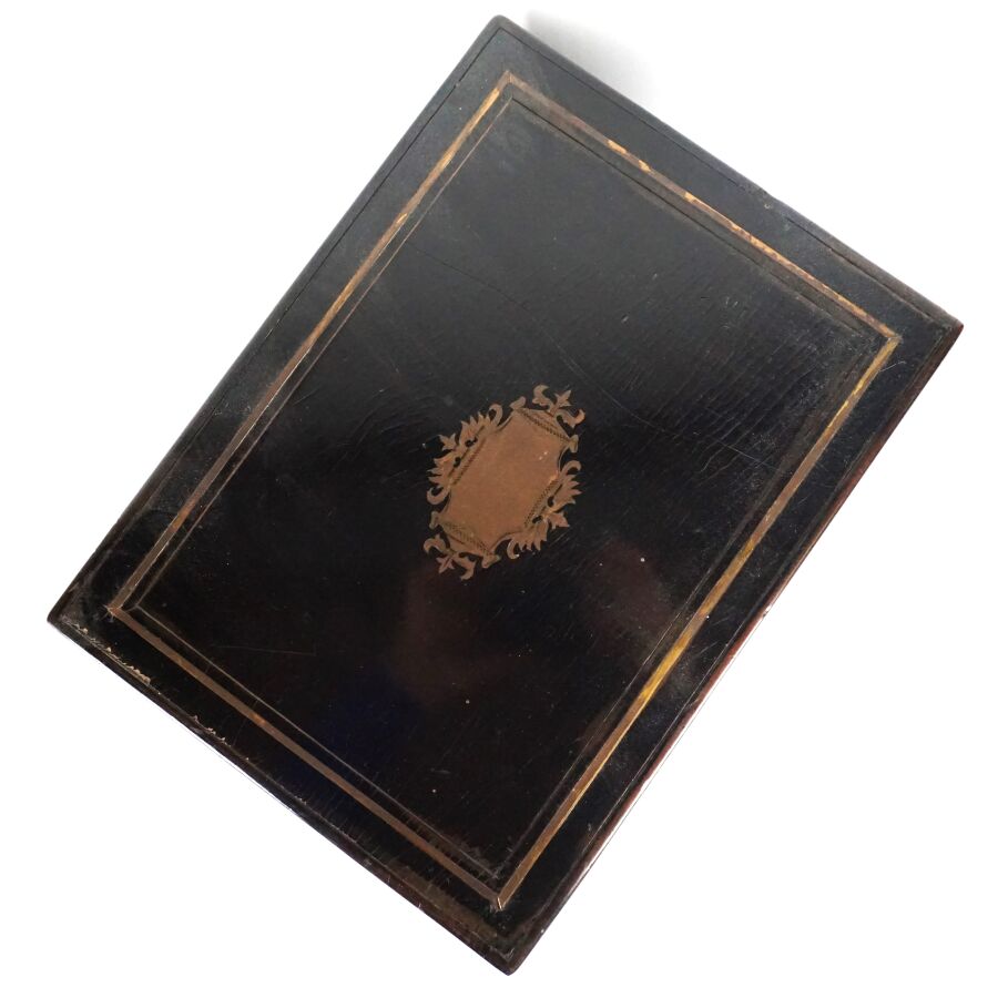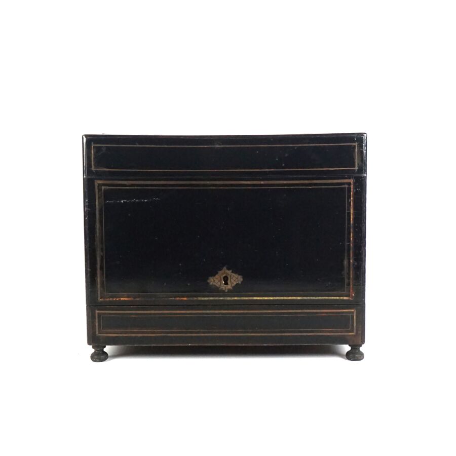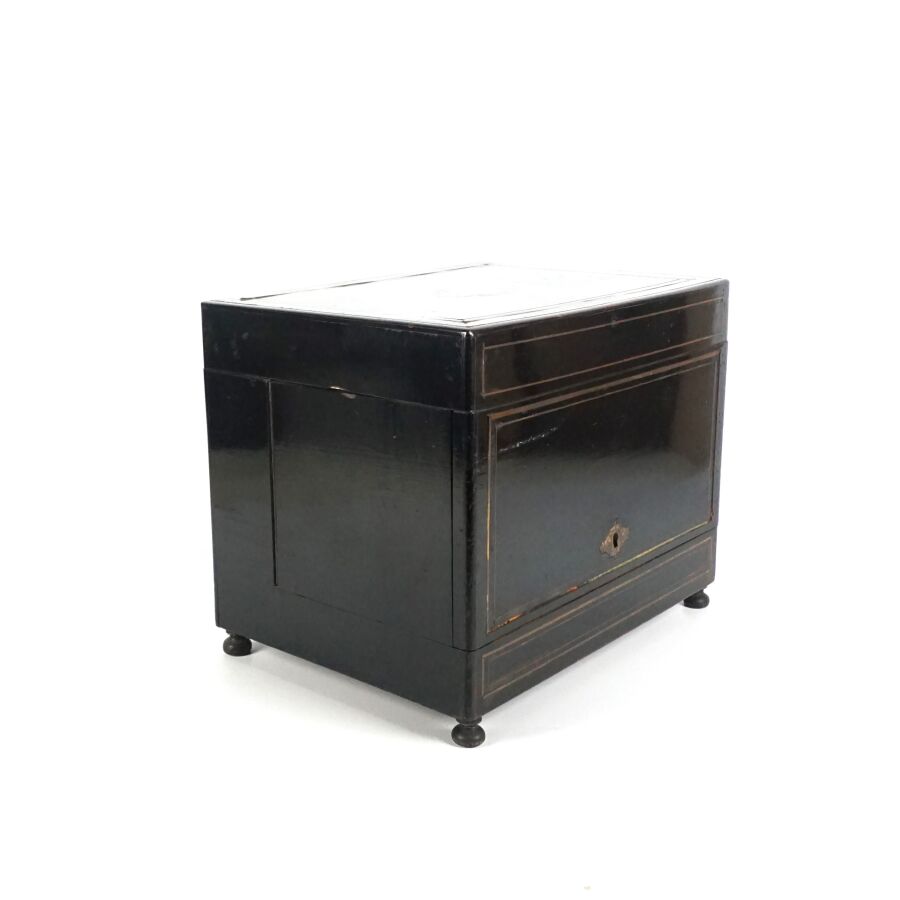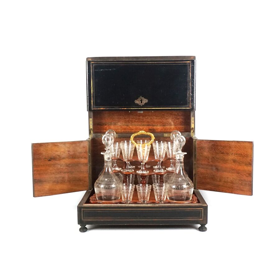 Cave à liqueur en bois noirci et incrustation de filets de laiton découvrant quatre carafes pansues en verre avec leur bouchon sphérique et quatorze verres à liqueur à décor gravé, couvercle orné d'une plaque polylobée en laiton, d'époque Napoléon III, Dim. Fermée : 33 x 25 x 27,5 cm (petits éclats au bois, quelques sauts).