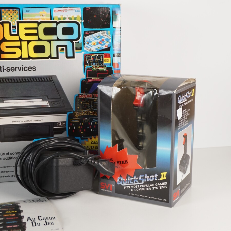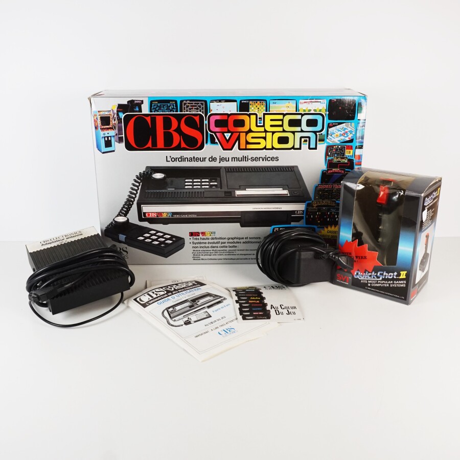 CBS ColecoVision version française : console / ordinateur de jeu multi-services, dans sa boîte d'origine avec sa notice et un adaptateur d'antenne (bel état).