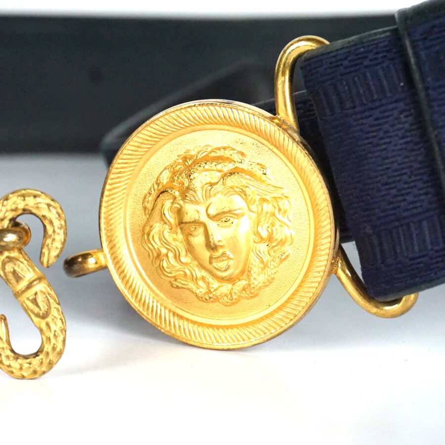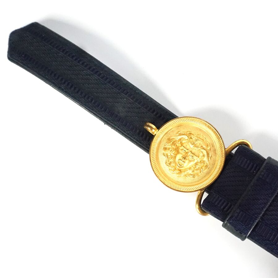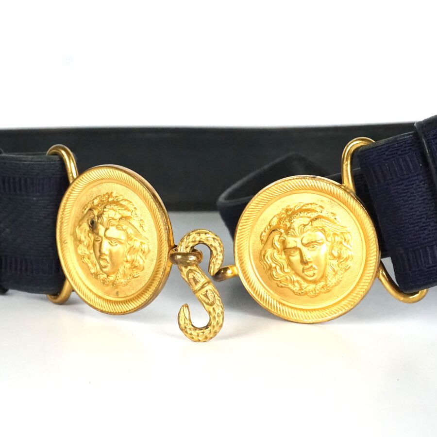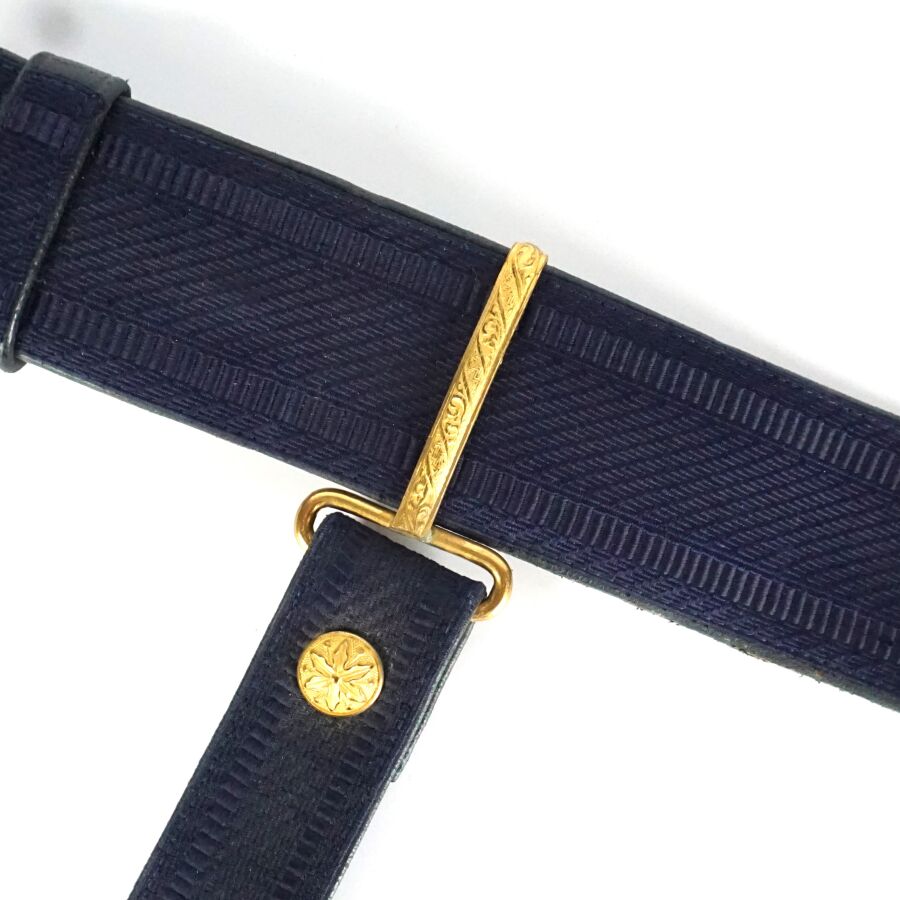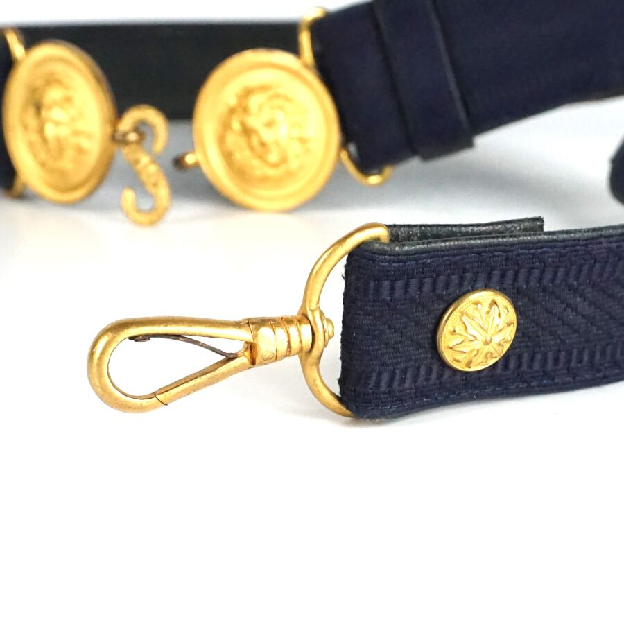 CEINTURON & PORTE-SABRE D'OFFICIER DE GENDARMERIE MOBILE POUR LA GRANDE TENUE MODELE 31, double plaque circulaire en métal doré à la tête de gorgone, ceinturon en laine mohair bleu foncé doublée de cuir bleu foncé, BE/TBE.