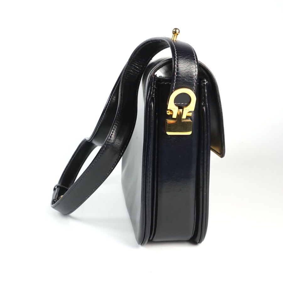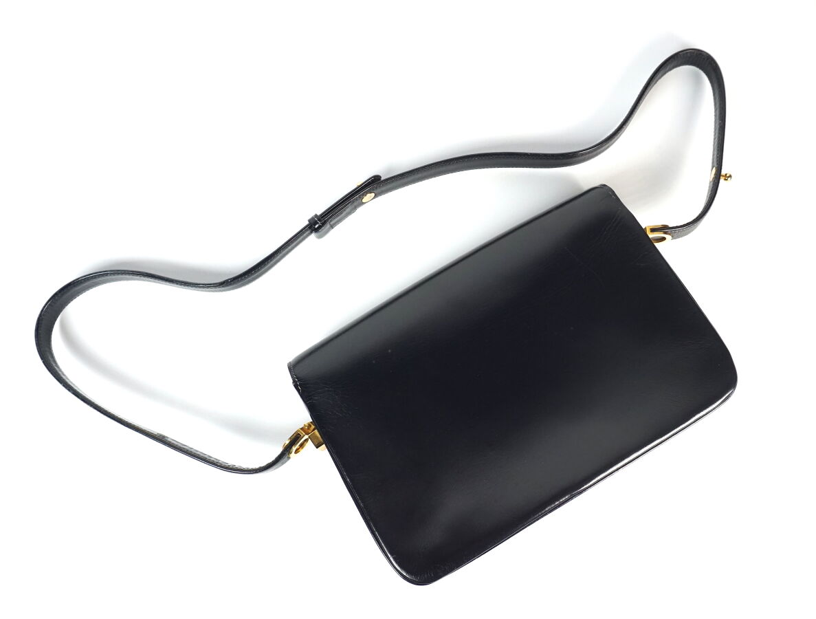 CELINE : Sac rectangulaire porté épaule en cuir bleu, fermeture à rabat par boucle en métal doré ornée d'une calèche, bandoulière ajustable, intérieur à compartiments en cuir bleu, L. 24 cm, H. 16 cm, Prof. 5.5 cm (usures d'usage).