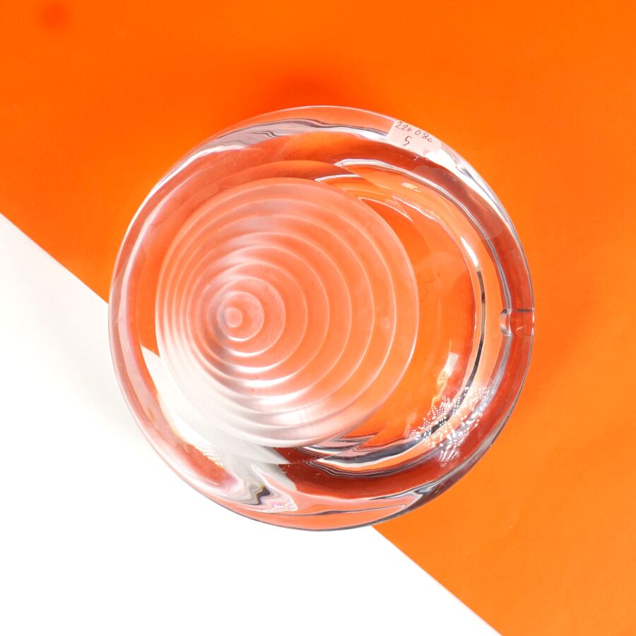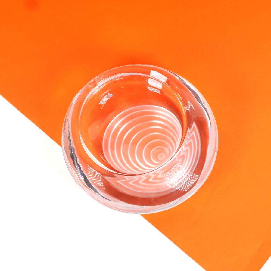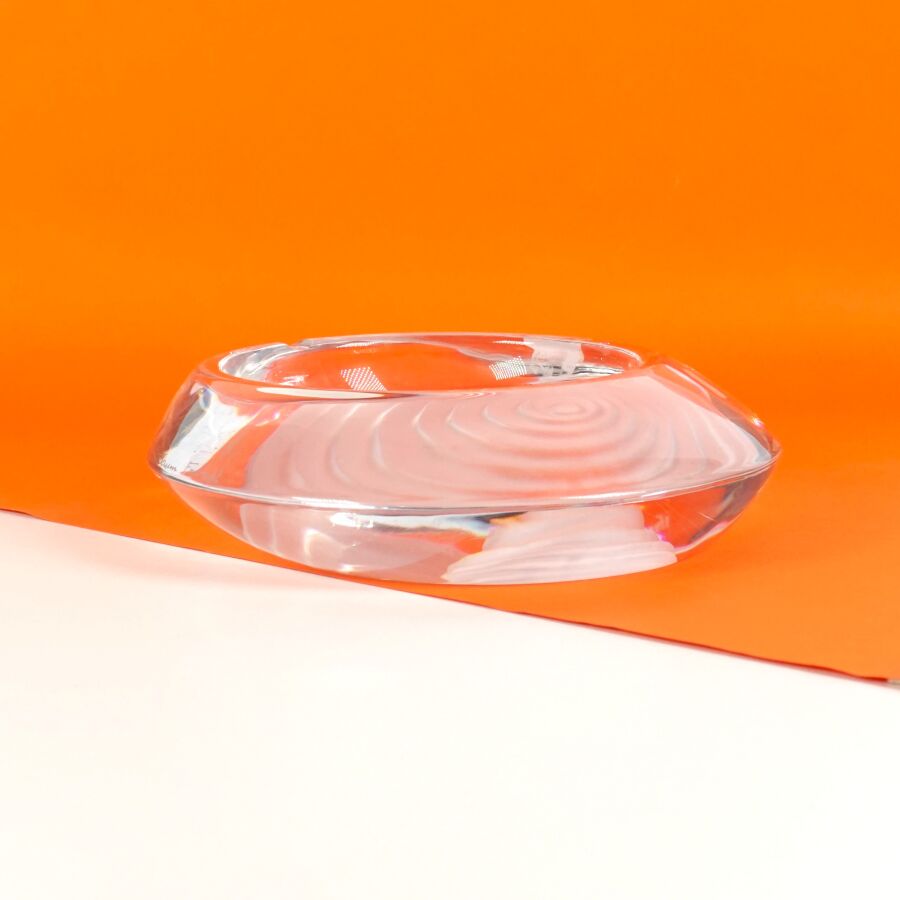 Cendrier en verre partiellement dépoli à décor de motifs géométriques formant trompe l'oeil, D. 17 cm.
