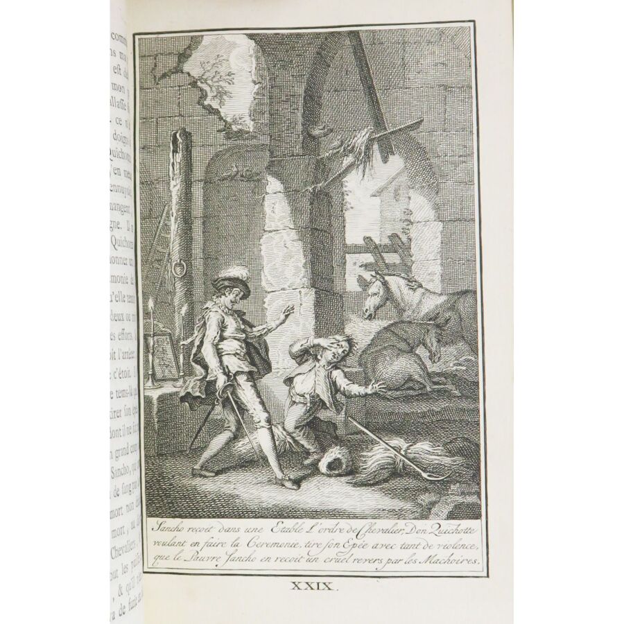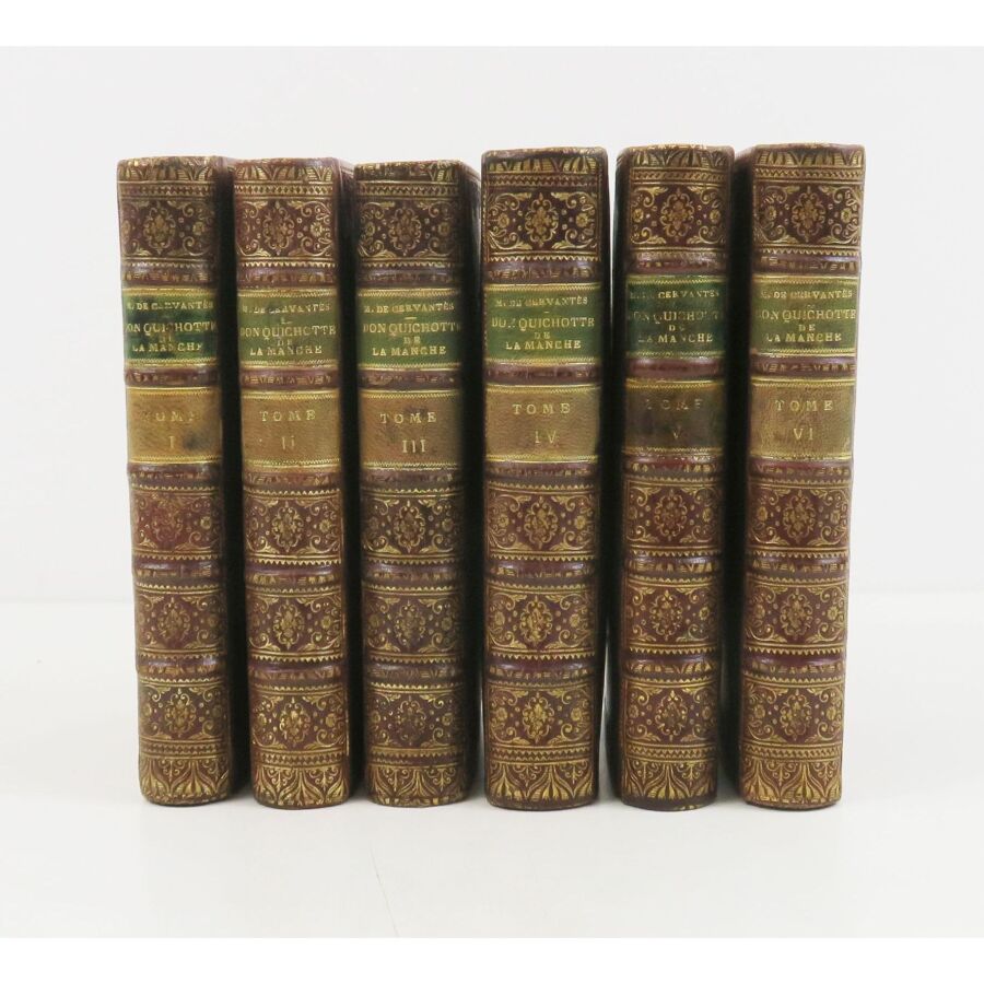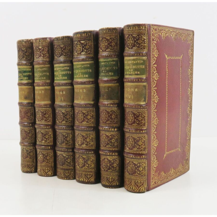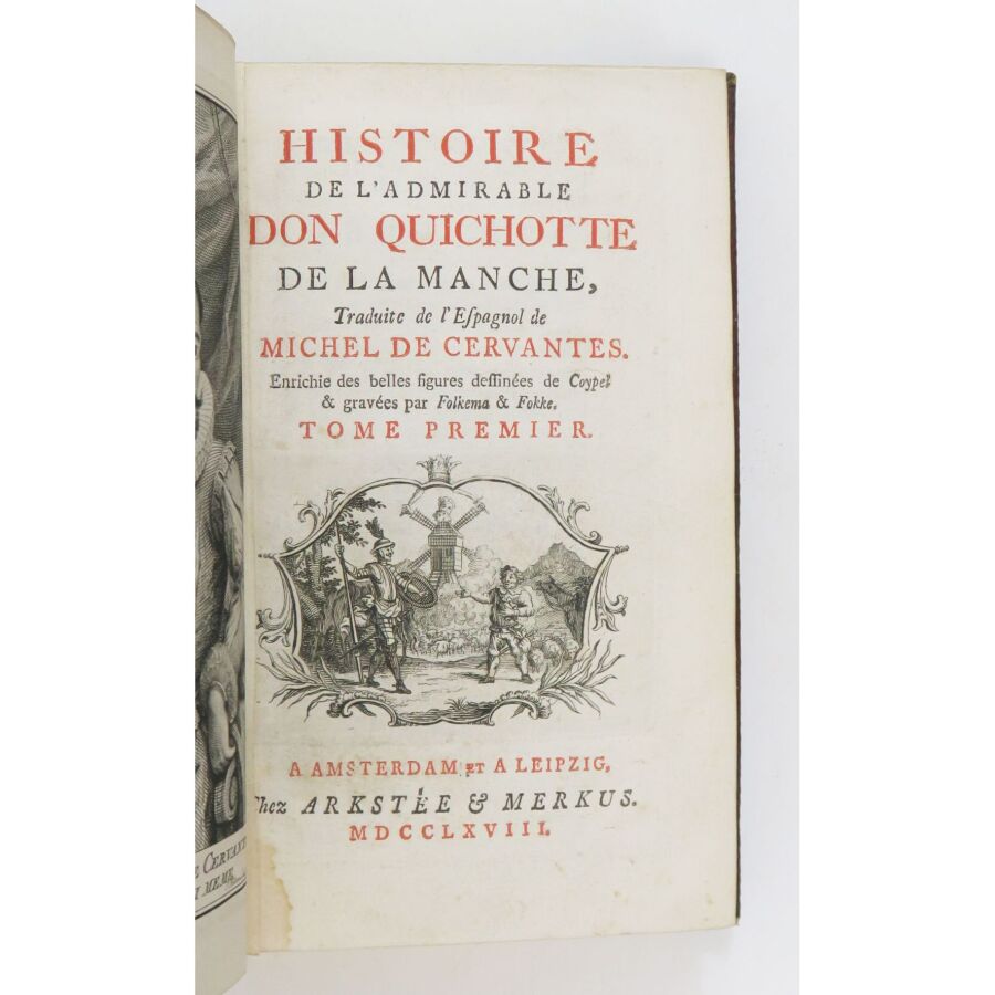 CERVANTES (Miguel de). Histoire de l'admirable Don Quichotte de la Manche. Amsterdam & Leipzig, Arkstée & Merkus, 1768. 6 vol. in-12, maroquin rouge, dos à nerfs richement ornés, large motif doré encadrant les plats, roulette dorée sur les coupes, tranches dorées (reliure hollandaise). Nouvelle édition illustrée d'un faux-titre gravé, d'un portrait de Cervantes, de 6 vignettes sur les titres (l'une répétée), ainsi que de 31 figures hors-texte dessinées par Coypel et gravées par Folkéma & Fokke. Précieux exemplaire en maroquin ancien. Quelques usures mineures, quelques défauts intérieurs mineurs.