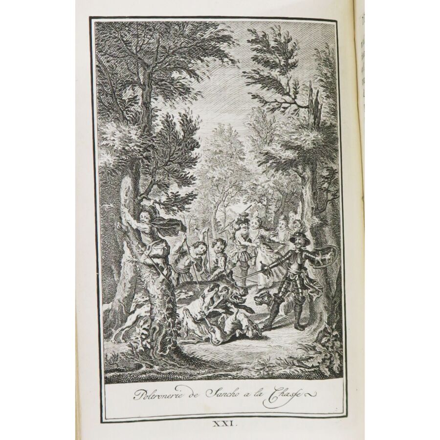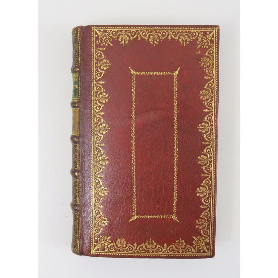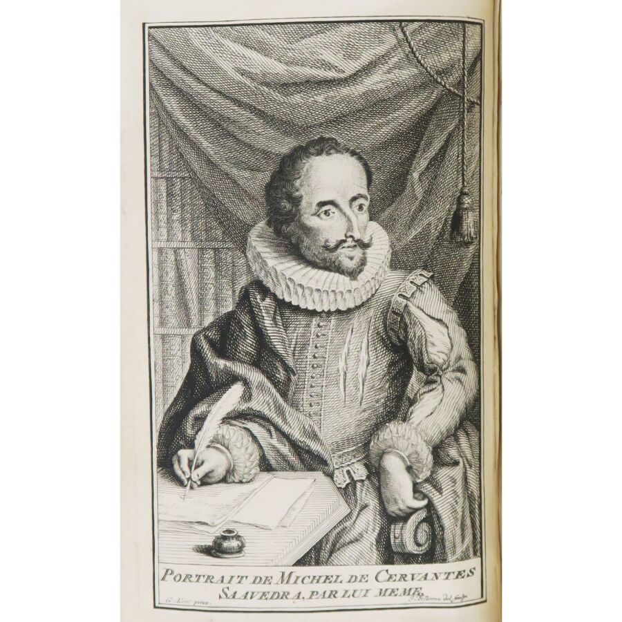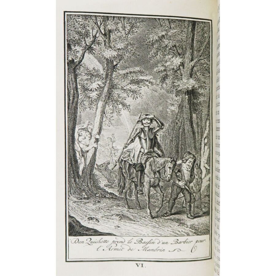 CERVANTES (Miguel de). Histoire de l'admirable Don Quichotte de la Manche. Amsterdam & Leipzig, Arkstée & Merkus, 1768. 6 vol. in-12, maroquin rouge, dos à nerfs richement ornés, large motif doré encadrant les plats, roulette dorée sur les coupes, tranches dorées (reliure hollandaise). Nouvelle édition illustrée d'un faux-titre gravé, d'un portrait de Cervantes, de 6 vignettes sur les titres (l'une répétée), ainsi que de 31 figures hors-texte dessinées par Coypel et gravées par Folkéma & Fokke. Précieux exemplaire en maroquin ancien. Quelques usures mineures, quelques défauts intérieurs mineurs.