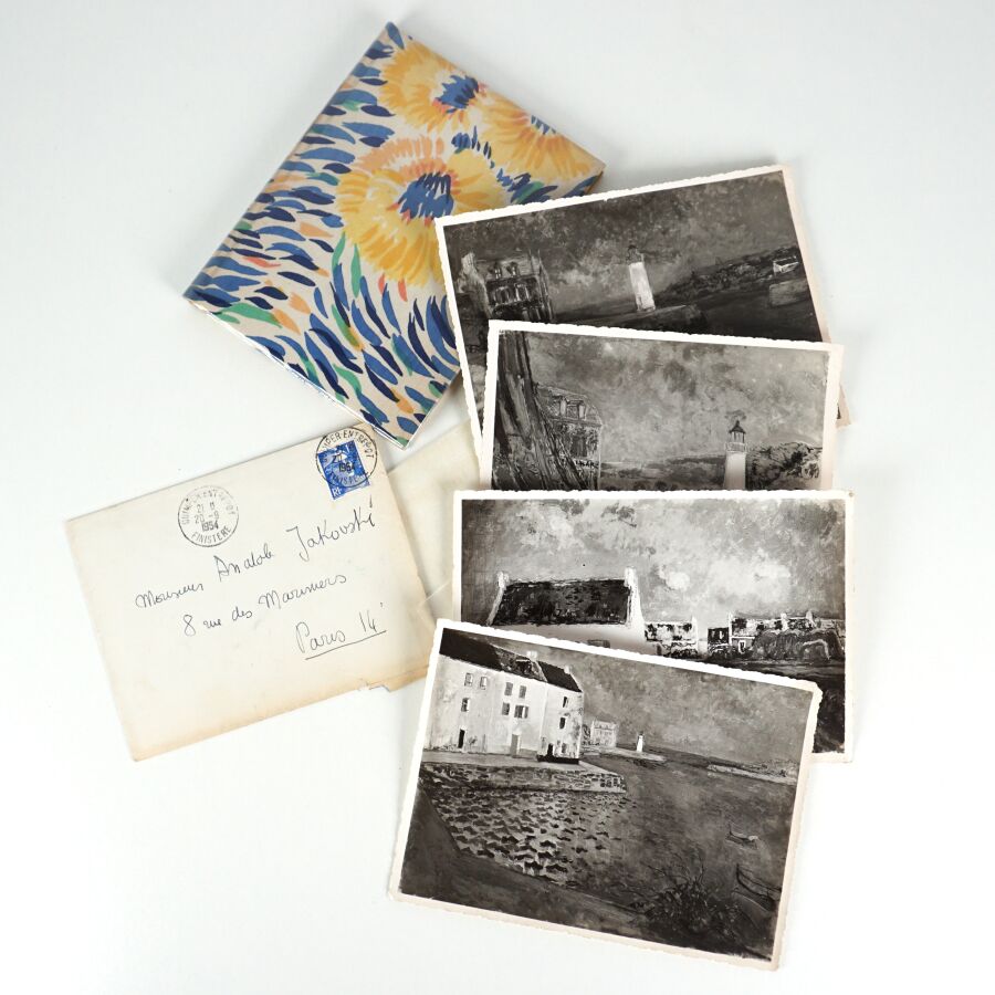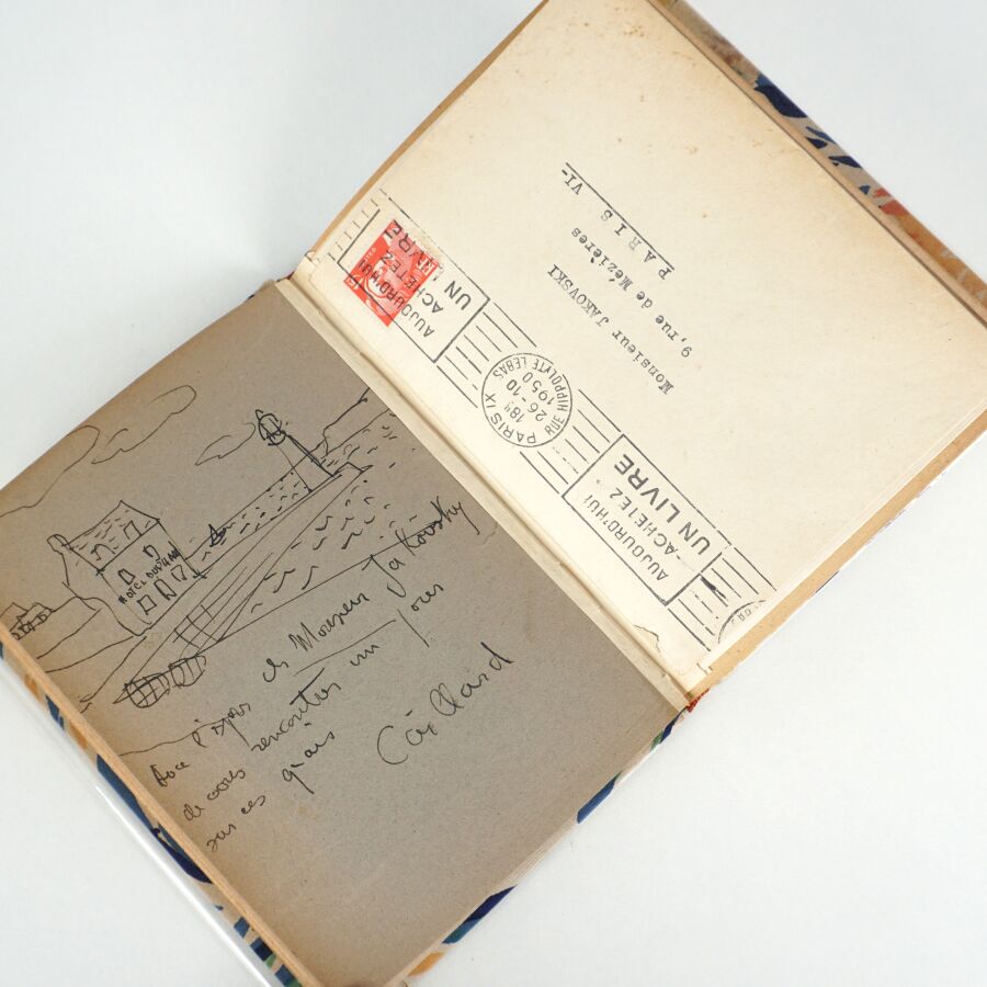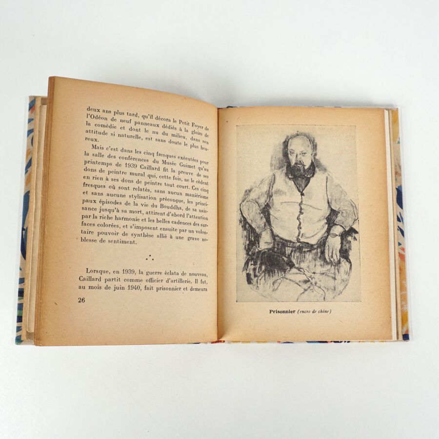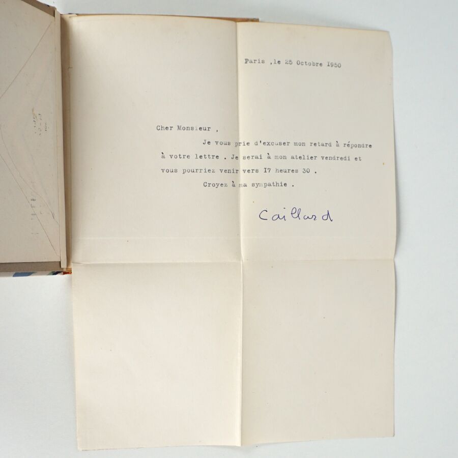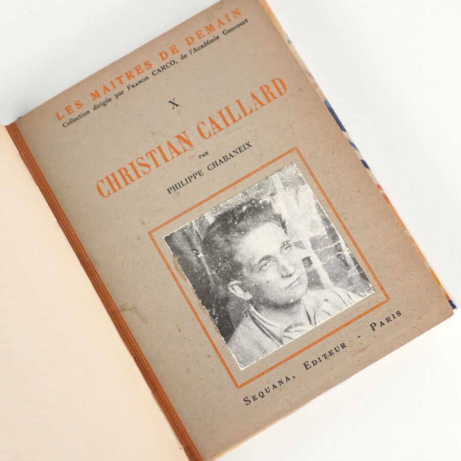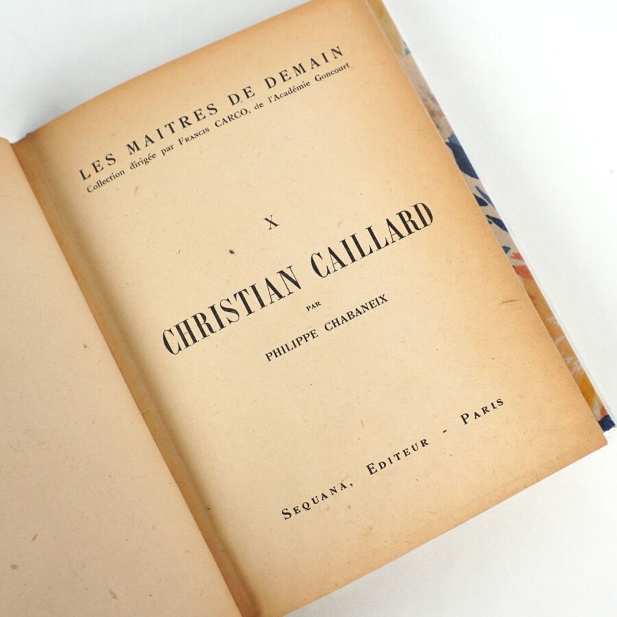 CHABANEIX (Philippe). Christian Caillard. Paris, Sequana, 1944. In-12, Bradel, toile illustrée en couleurs de motifs floraux, pièce de titre, couv. conservées. Édition originale du dixième ouvrage de la coll. ""Les Maîtres de demain"" dirigée par Francis Carco. Un des ex. du service de presse. Reproductions d'oeuvres de Caillard in et hors texte. Exemplaire enrichi d'un envoi autographe à Anatole Jakovsky orné d'un DESSIN ORIGINAL signé par Caillard sur le premier contreplat, d'un envoi autographe signé de Chabaneix à Jakovsky au faux-titre, de 2 lettres signées par Caillard à Jakovsky, datées de 1950 et 1954 avec enveloppes, et de 4 photographies en noir et blanc (17 x 12,5 cm) d'oeuvres de Caillard (vues de Belle-Île).
