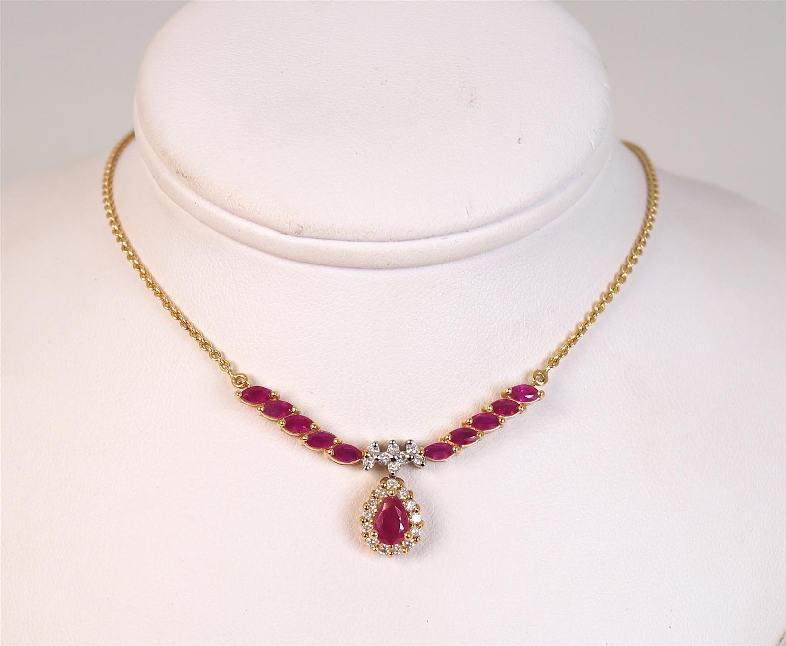 Chaine en or jaune 18 K (750/oo) ornée de 10 rubis taille navette un rubis poire et diamants. Poids brut : 6.4 g environ.