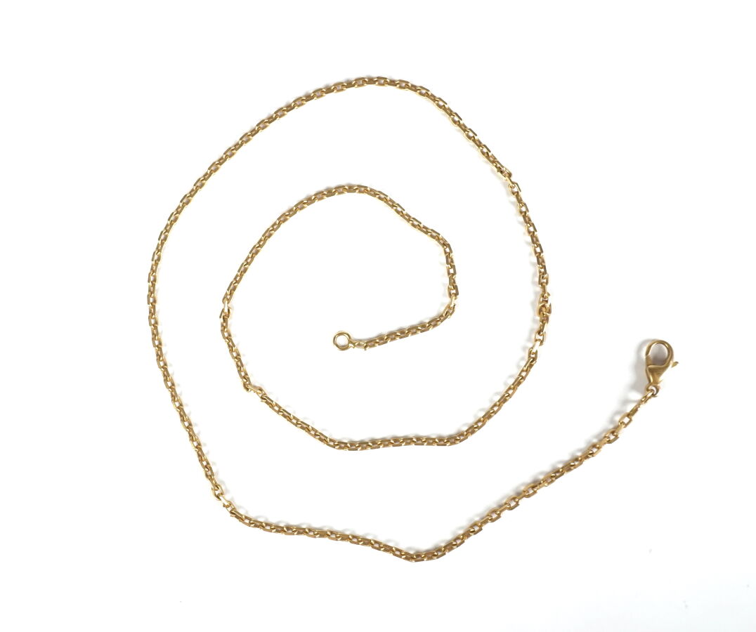 Chaîne en or jaune 18K (750/oo), maille forçat, fermoir mousqueton, L. 55 cm. Poids brut : 13.6 g environ.