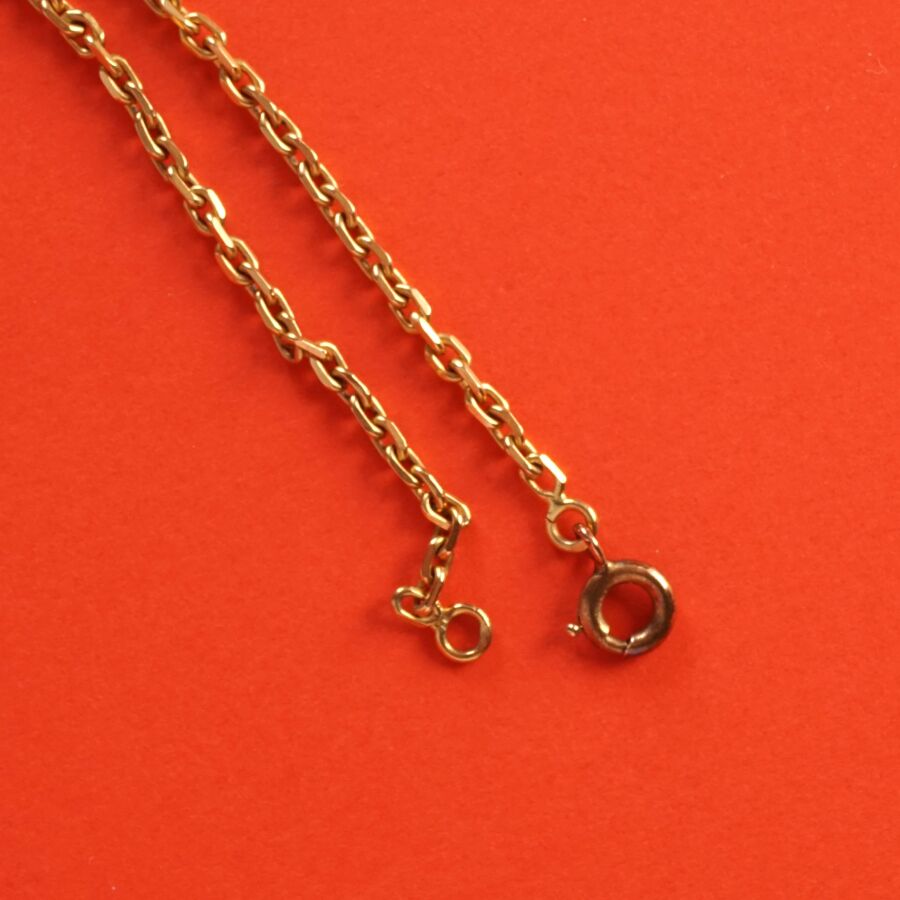 Chaîne en or jaune 18K (750/oo), maille forçat, fermoir à anneau ressort, L. 55.5/56 cm. Poids brut : 14.4 g environ (anneau probablement rapporté).