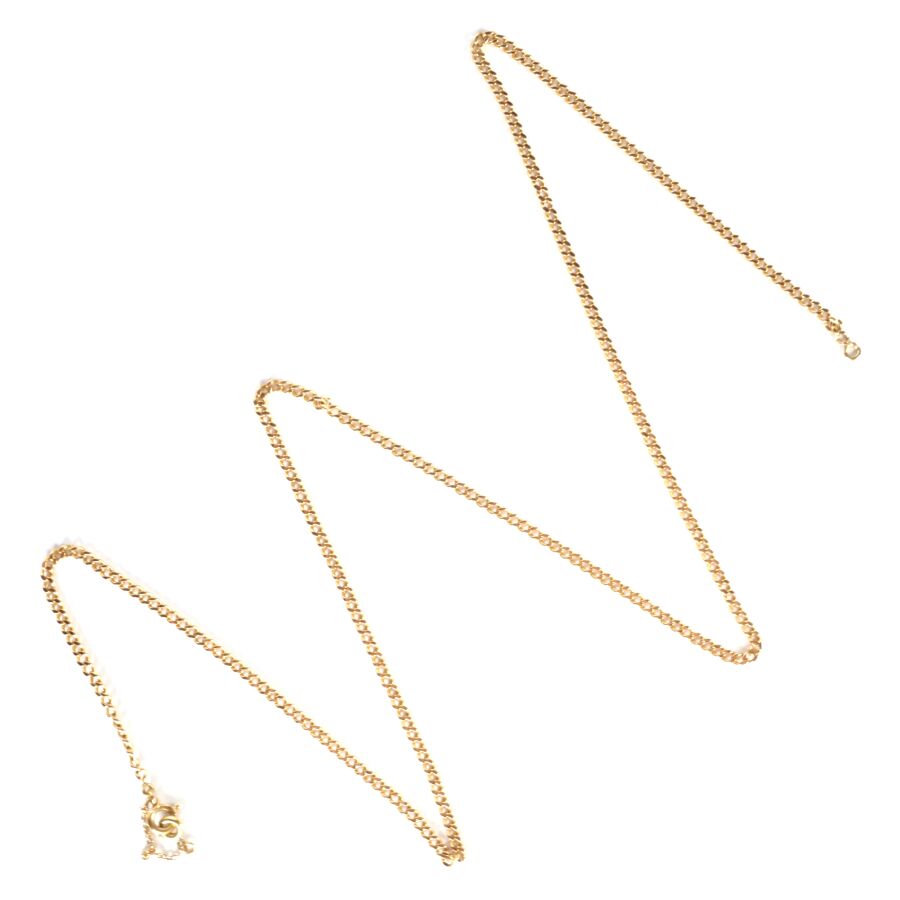 Chaîne en or jaune 18K (750/oo), maille forçat, fermoir à anneau ressort, avec sa chaîne de sécurité (manque l'anneau de réception), L. 61.5 cm. Larg. 2.8 mm. Poids brut : 13.1 g environ.