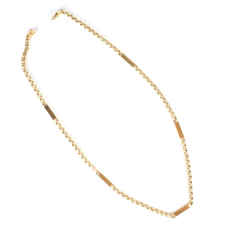 Chaîne en or jaune 18K (750/oo), maille gourmette alternée de 5 plaques rectangulaires, fermoir à cliquet avec 8 de sécurité, L. 46.5 cm. Larg. 4 mm. Poids brut : 15.6 g environ.