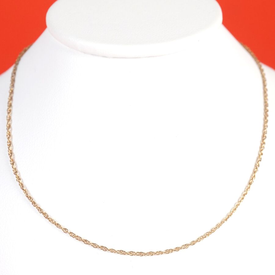 Chaîne fine en or jaune 18k (750/oo), maille entrelacée, fermoir à anneau ressort, L. 42.5. Poids brut : 0.9 g environ.