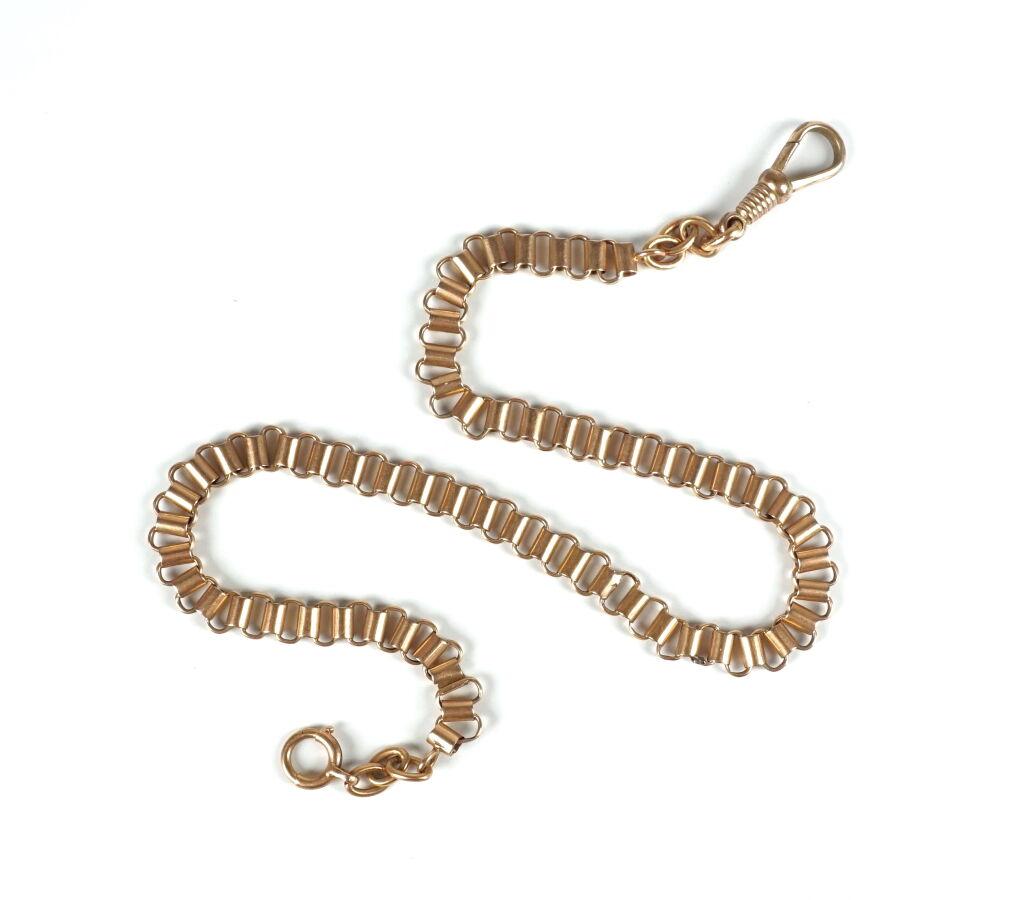 Chaine giletière en or jaune 18K (750/oo), formée d'anneaux ovales réunis par des cylindres, L. 34 cm. Poids brut : 12.8 g environ.