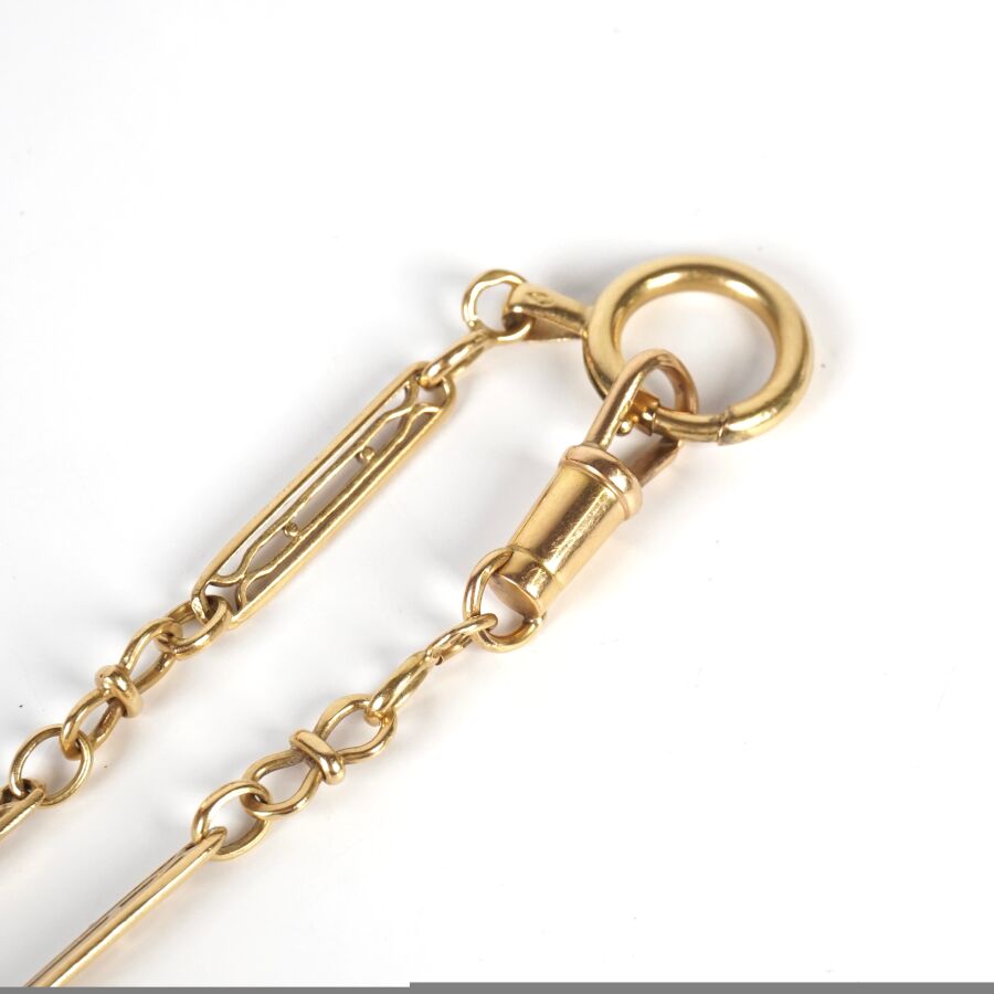 Chaine giletière en or jaune 18K (750/oo), maille allongée à décor de fenestrages, 2 fermoirs mousquetons, L. 38.5 cm. Poids brut : 18.6 g environ.