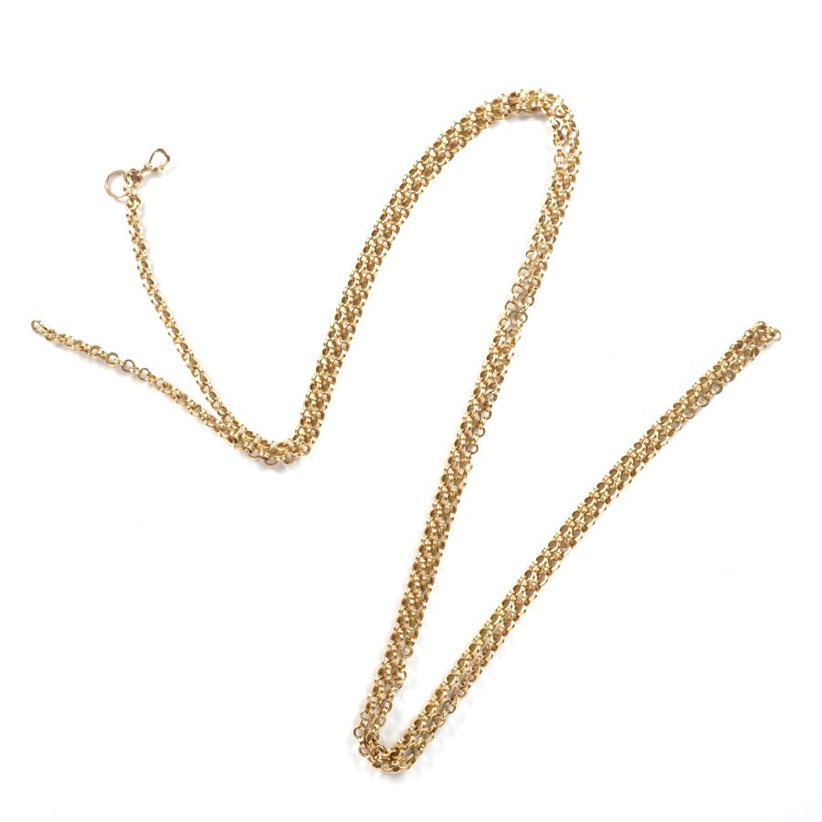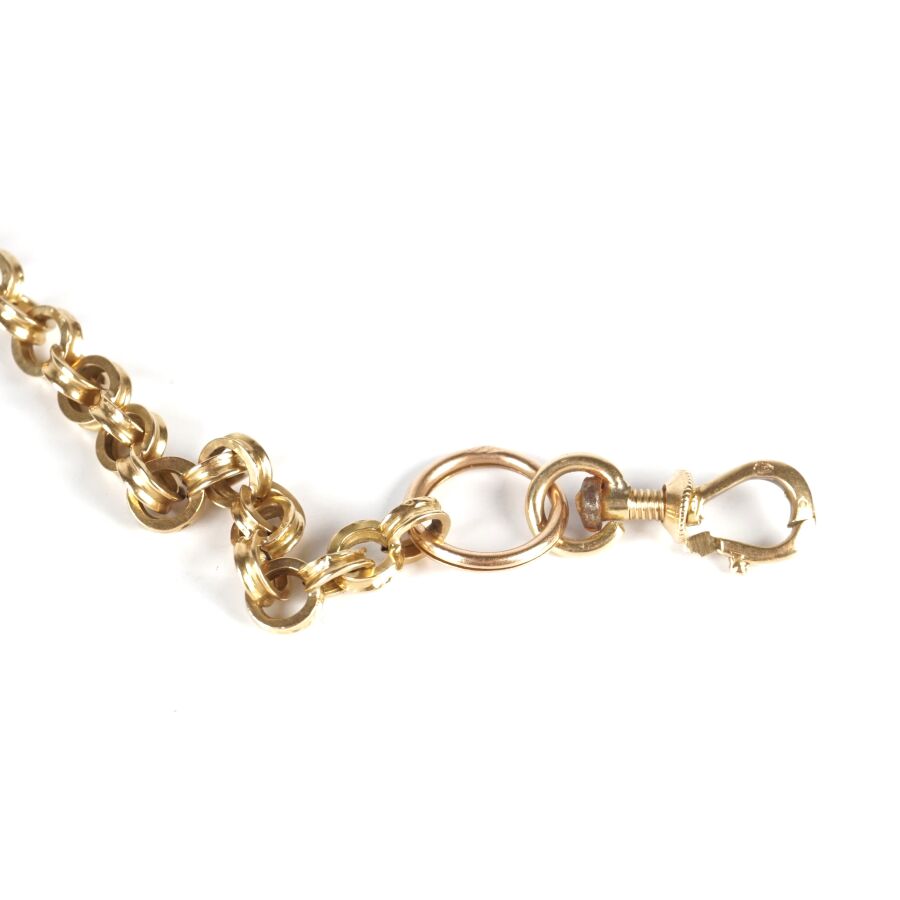 Chaîne giletière en or jaune 18K (750/oo), poinçon tête d'aigle (sur l'accroche) et poinçon hibou sur la chaîne, maille jaseron, L. 143 cm. Poids brut : 22.6 g environ.