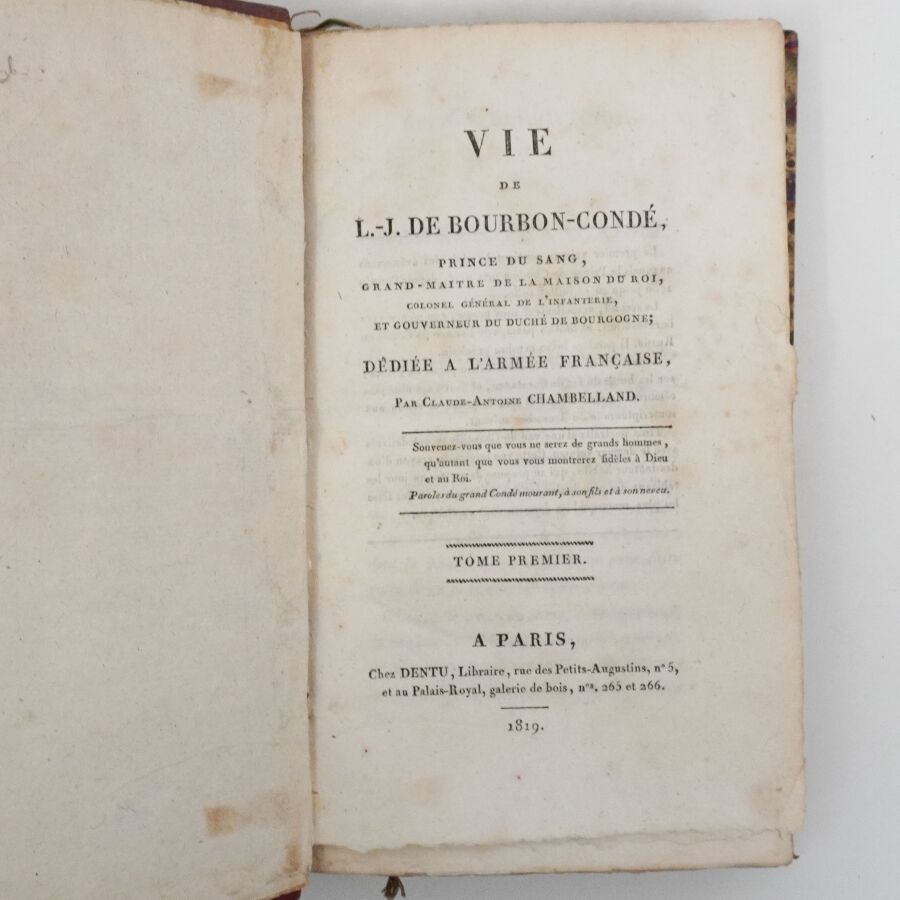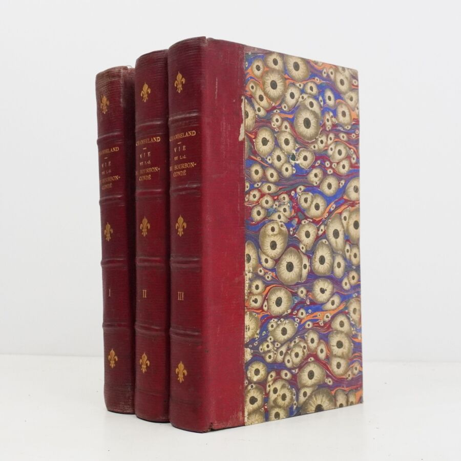 CHAMBELLAND (Claude-Antoine). Vie de L. -J. de Bourbon-Condé, prince du sang, grand-maître de la maison du roi, colonel général de l'infanterie et gouverneur du duché de Bourgogne ; dédiée à l'Armée Française. Paris, Dentu, 1819-1820. 3 vol. in-8, demi-mar. rouge, dos à nerfs ornés de fleurs de lys dorées, titre et tomaison dorés (reliure post.). Qqs très petits travaux de vers aux mors.