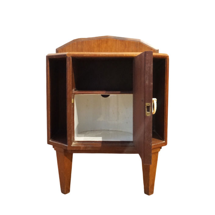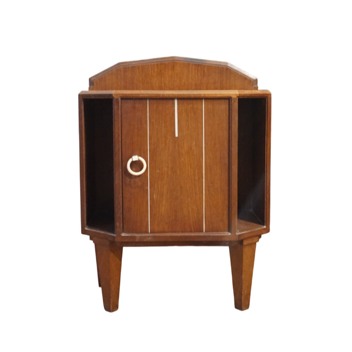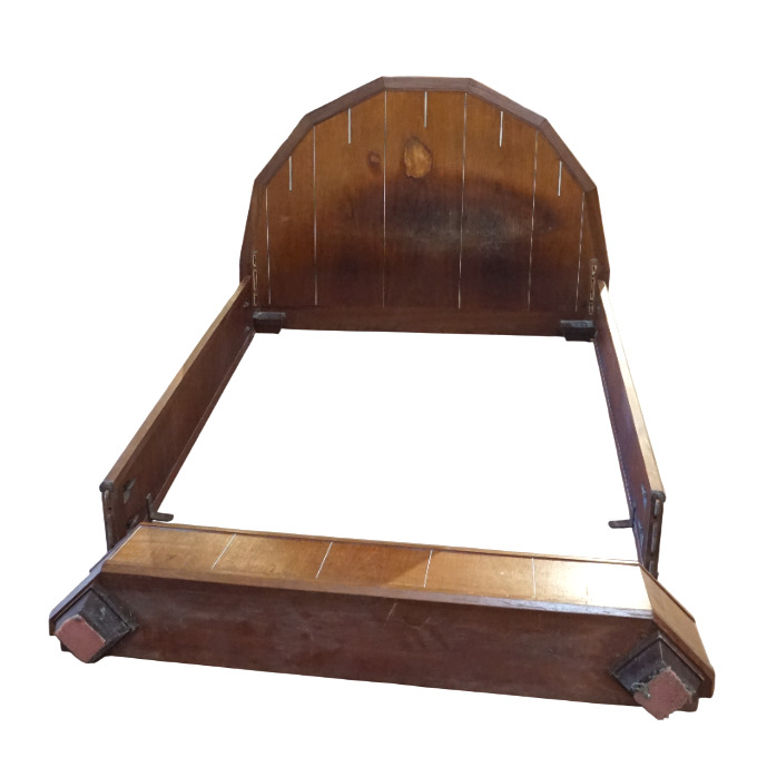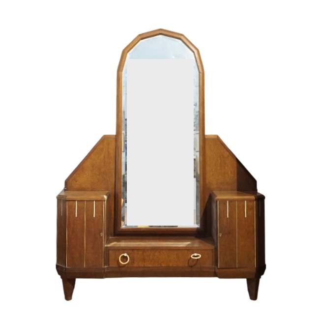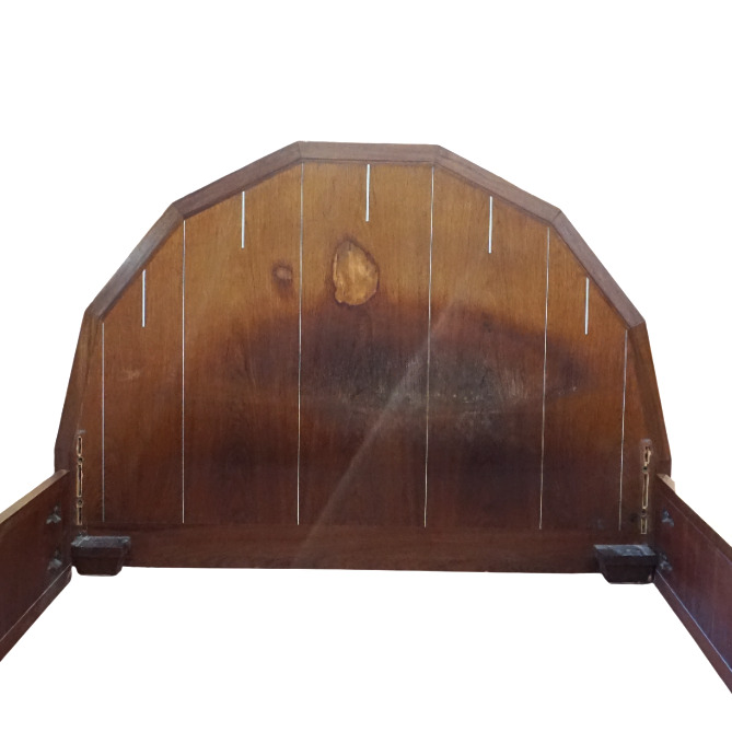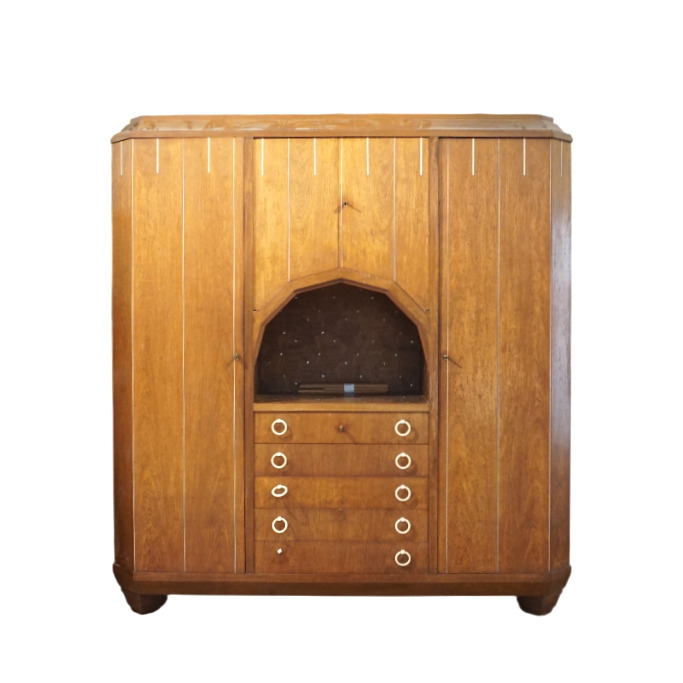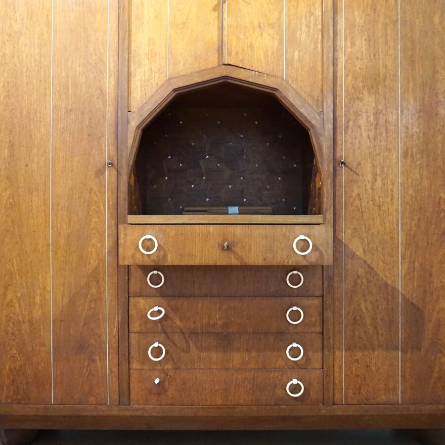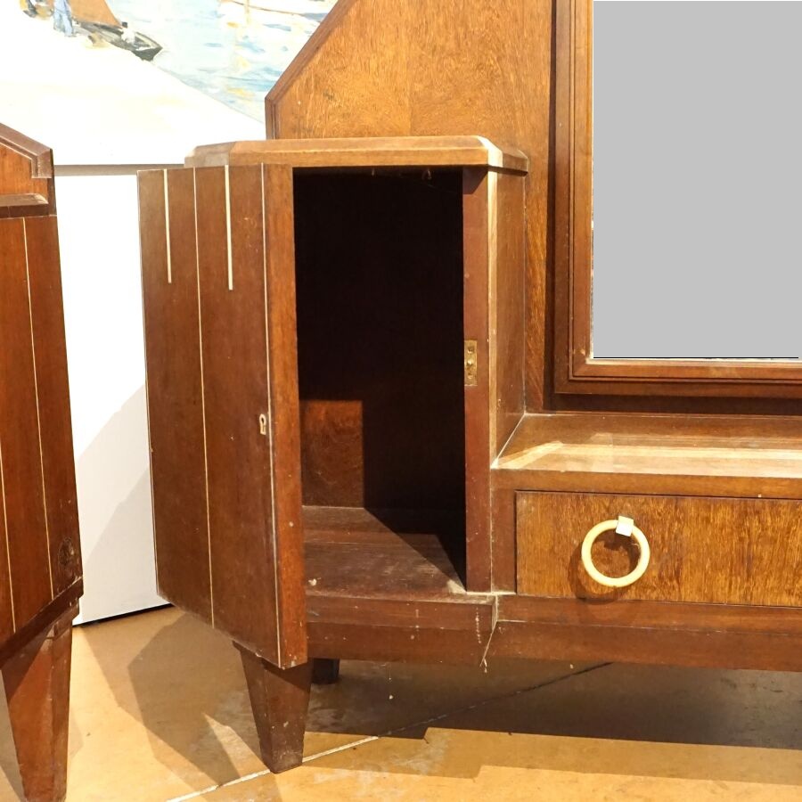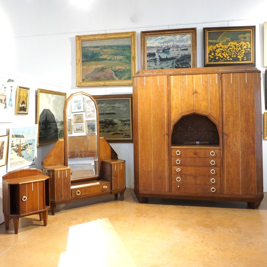 Chambre à coucher en bois et bois de placage à décor Art Déco de liserés et incrustation de nacre, poignées de tirage en os et bakélite, comprenant une armoire ouvrant en façade à deux portes latérales et un vantail en partie haute, niche centrale et cinq tiroirs en partie basse, un chevet ouvrant à un vantail découvrant deux niveaux, une coiffeuse basse avec son miroir central, deux vantaux latéraux et un tiroir en partie basse et un bois de lit, Dim. Armoire : 209 x 190 x 48 cm. Dim. Chevet : 71 x 52 x 30 cm. Dim. Coiffeuse : 174 x 129 x 32 cm. Dim. Tête de lit : 117 x 171 cm (usures, sauts).