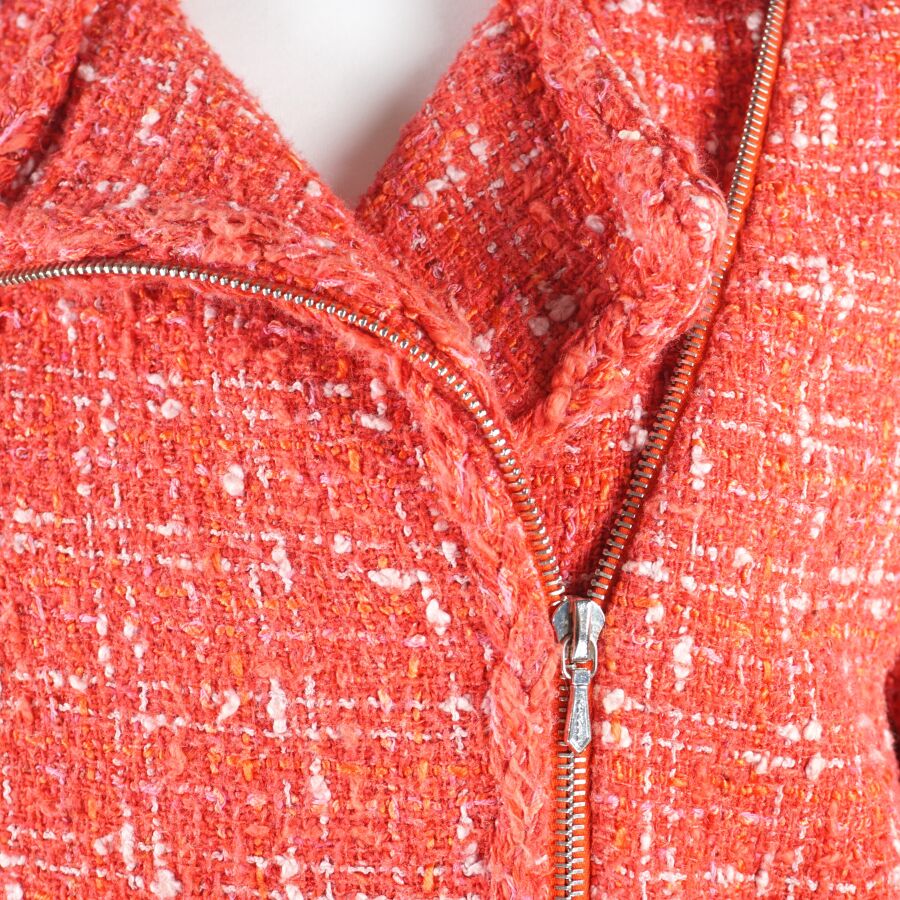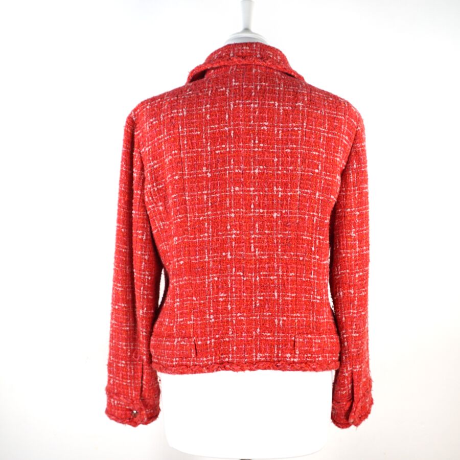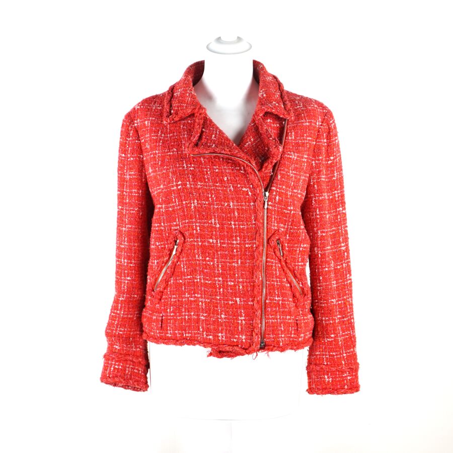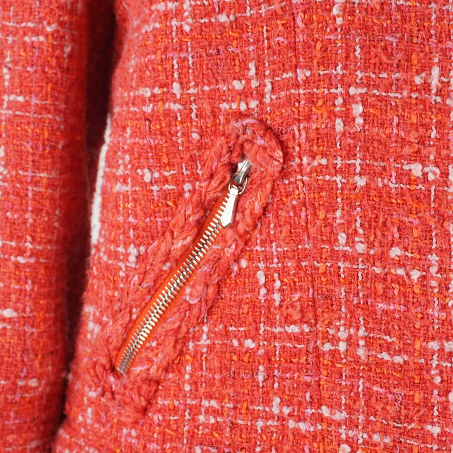 CHANEL : Jolie veste en soie, coton, lin et viscose rouge-rose, doublure en soie rouge, fermeture zippée à l'avant logotée, deux poches basses fermant par une fermeture zippée logotée, taille indiquée 42, avec étiquette, boutons argentés logotés aux manches, avec son cintre en feutrine noire logoté doré, H. Du haut du col (arrière) au bas de la veste : 56 cm (avec un empiècement et deux boutons supplémentaires, légers fils tirés).