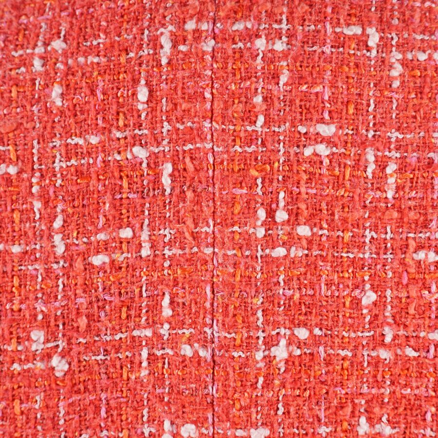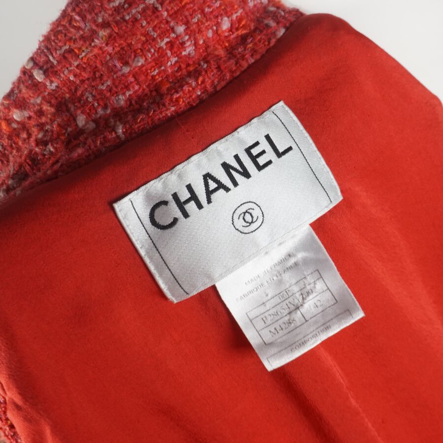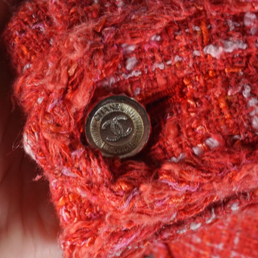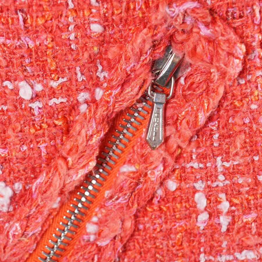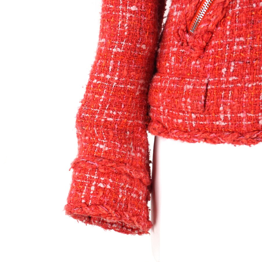 CHANEL : Jolie veste en soie, coton, lin et viscose rouge-rose, doublure en soie rouge, fermeture zippée à l'avant logotée, deux poches basses fermant par une fermeture zippée logotée, taille indiquée 42, avec étiquette, boutons argentés logotés aux manches, avec son cintre en feutrine noire logoté doré, H. Du haut du col (arrière) au bas de la veste : 56 cm (avec un empiècement et deux boutons supplémentaires, légers fils tirés).