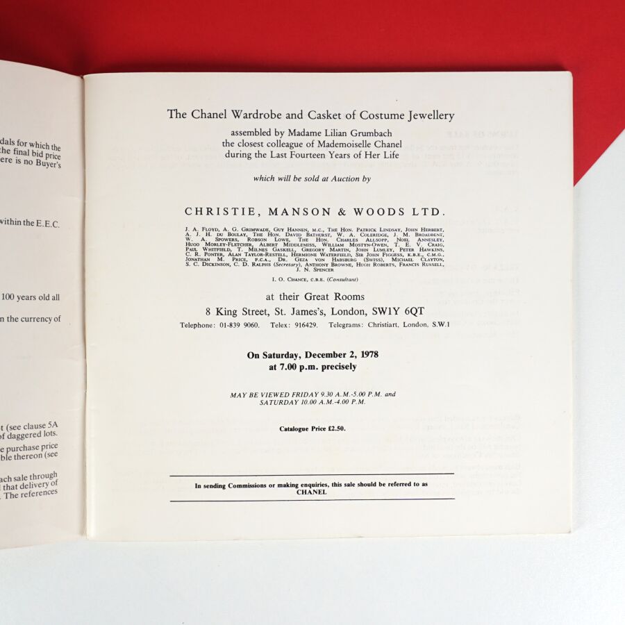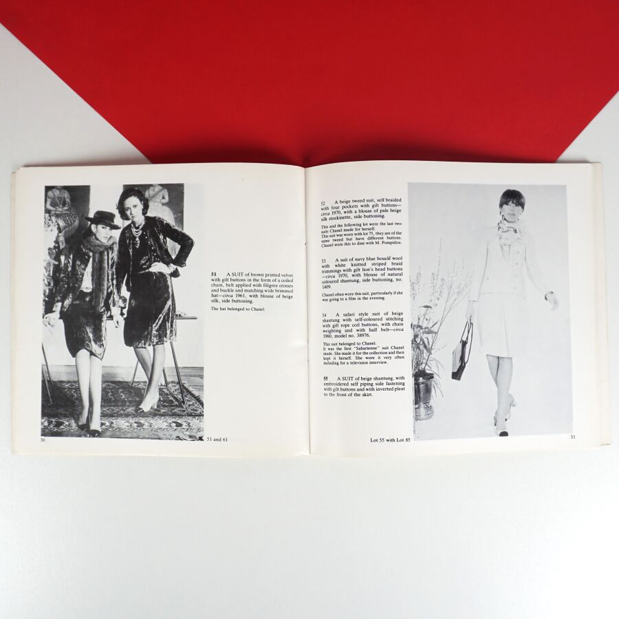 CHANEL (Maison). Sale of the Personal Collection of Chanel. Londres, Christie's, 1978. In-8 carré broché, couv. ill. en couleurs. Catalogue de la vente de la garde-robe et des bijoux de Gabrielle Chanel (une quarantaine de bijoux et près de 80 vêtements créés par Chanel et pour la plupart portés par la couturière elle-même) rassemblés par Lilian Grumbach, amie et proche collaboratrice de Mlle Chanel durant ses 14 dernières années.