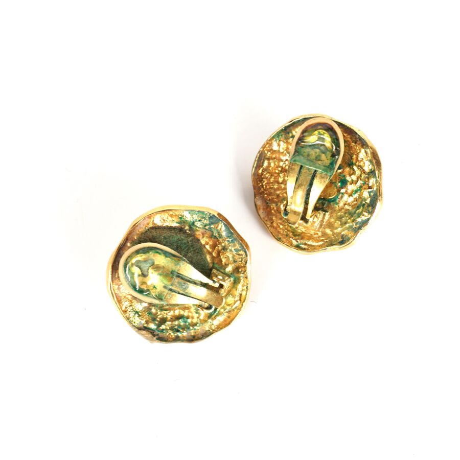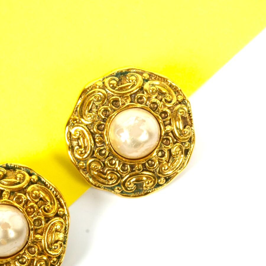 CHANEL : Paire de clips d'oreille de forme ronde en métal doré à motif d'entrelacs, centrés d'une demi-perle de fantaisie, signées au revers, Diam. 3.1 cm (usures, manque le caoutchouc et oxydations).