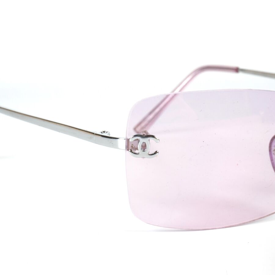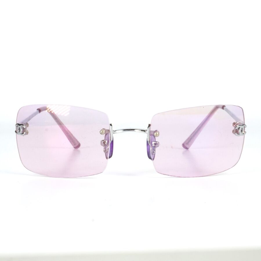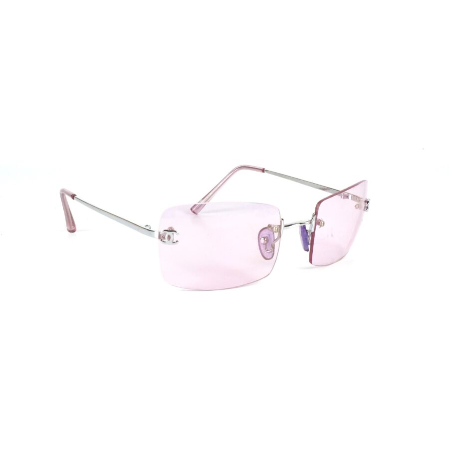 CHANEL : Paire de lunettes, monture en métal argenté, branches ornées du double C, verre rose fumé, sans étui (usures).