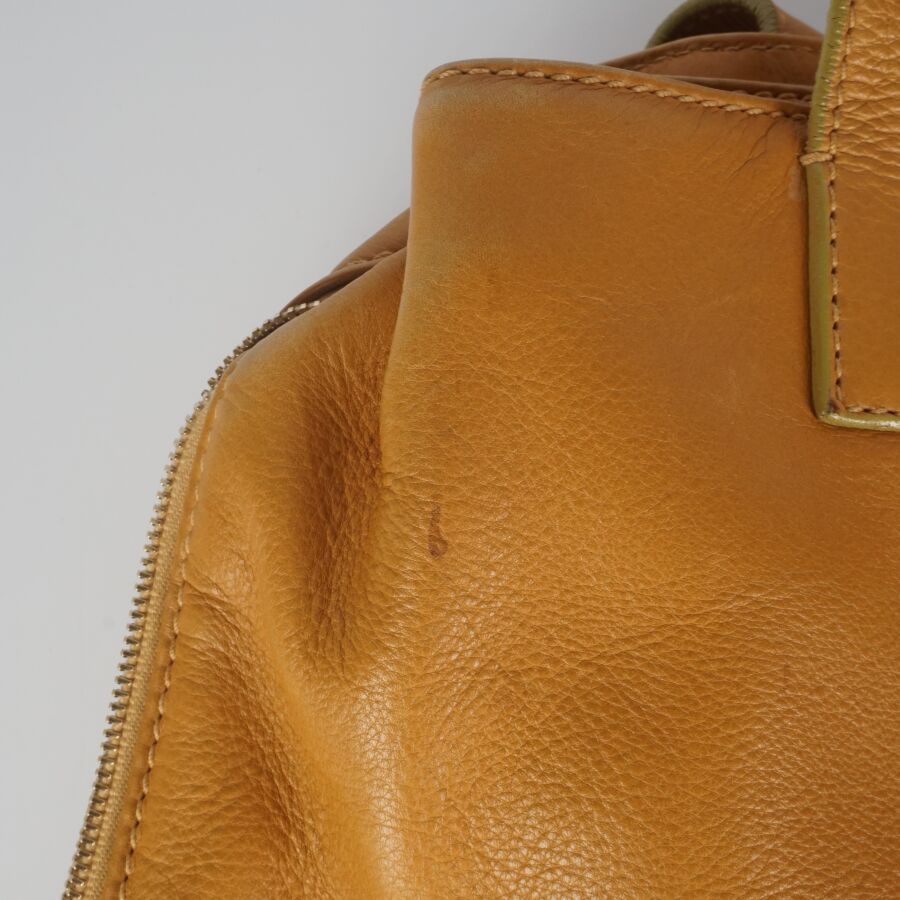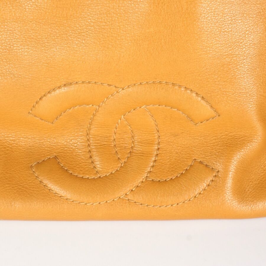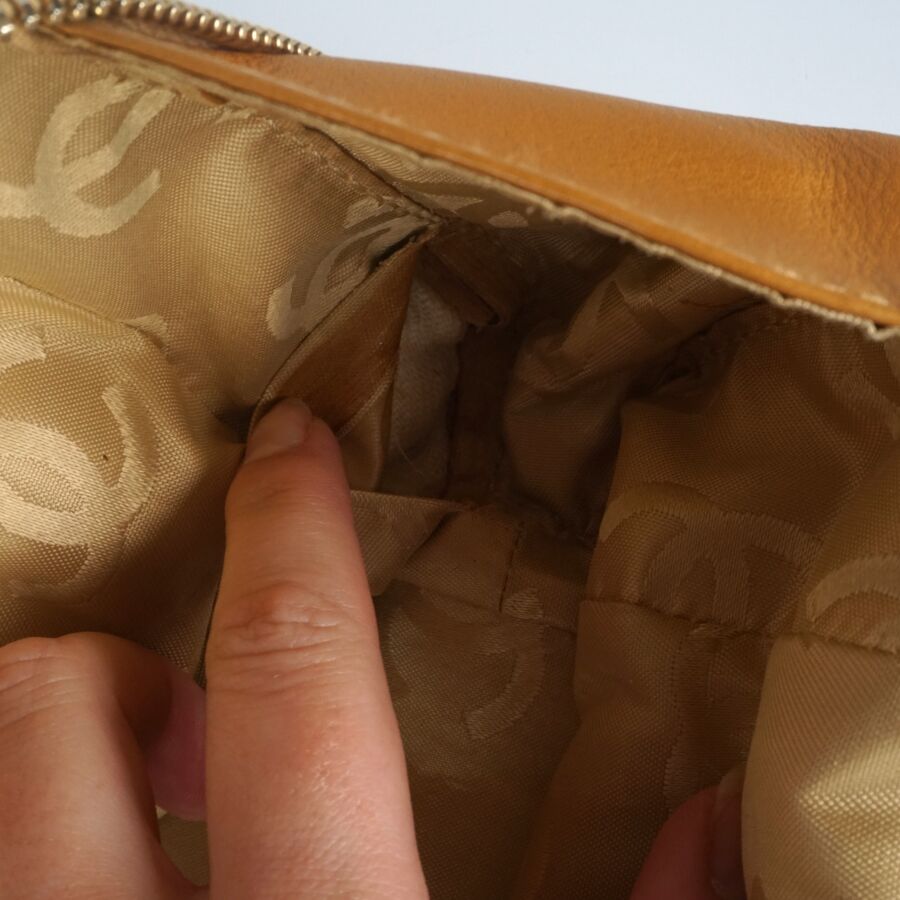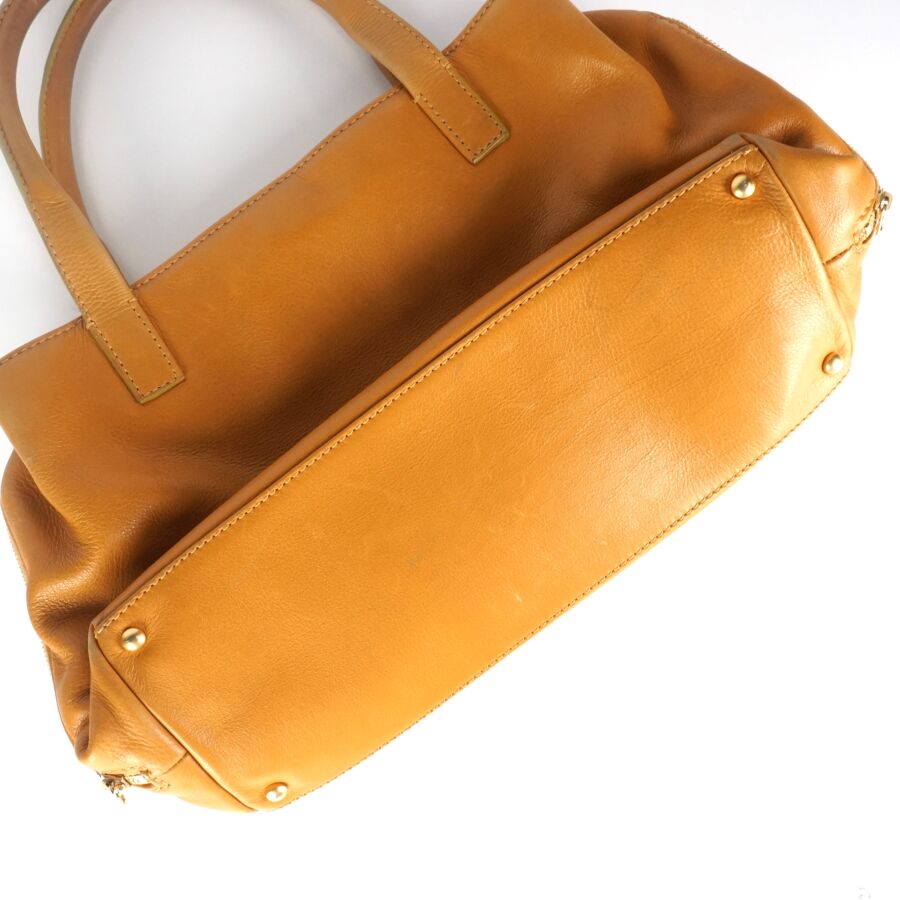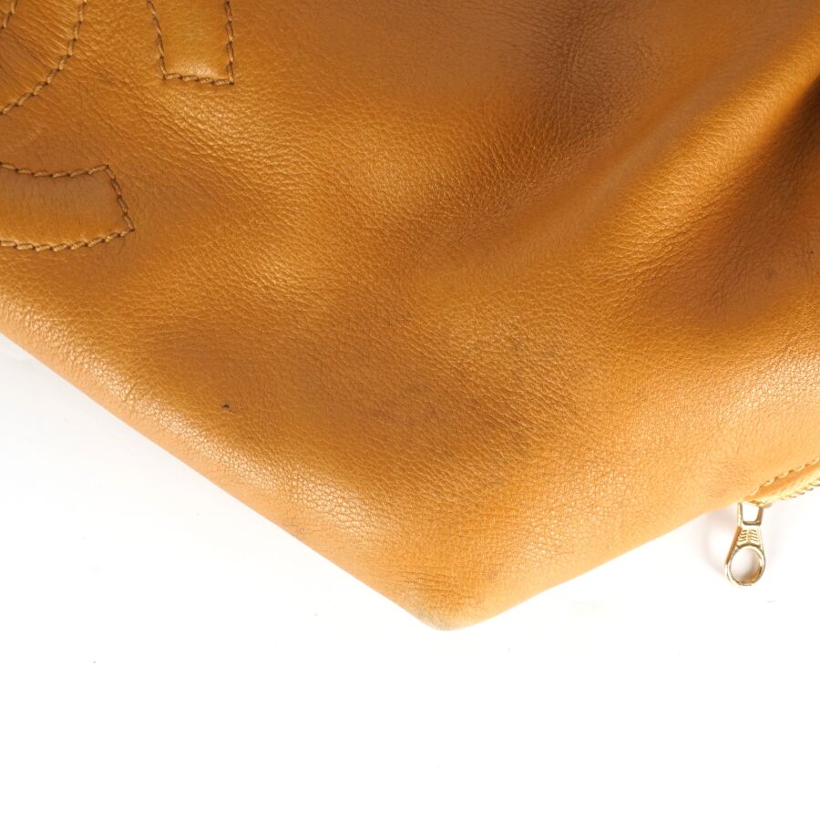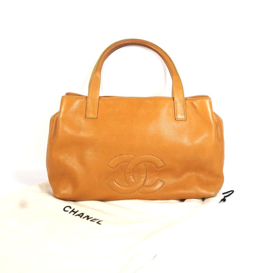 CHANEL : Sac cabas en cuir couleur havane et surpiqures, deux anses supérieures, fermeture zippée, intérieur soie beige à décor du logo de la Maison, deux compartiments sur les deux faces à fermeture par boutons pression aimanté et logoté, face principale à motif du double C de la Maison, présenté avec son dustbag, Dim. Hors anses : 22 cm x 40 cm x 14 cm (usures notamment aux coins, déchirure interne, quelques griffures et traces).