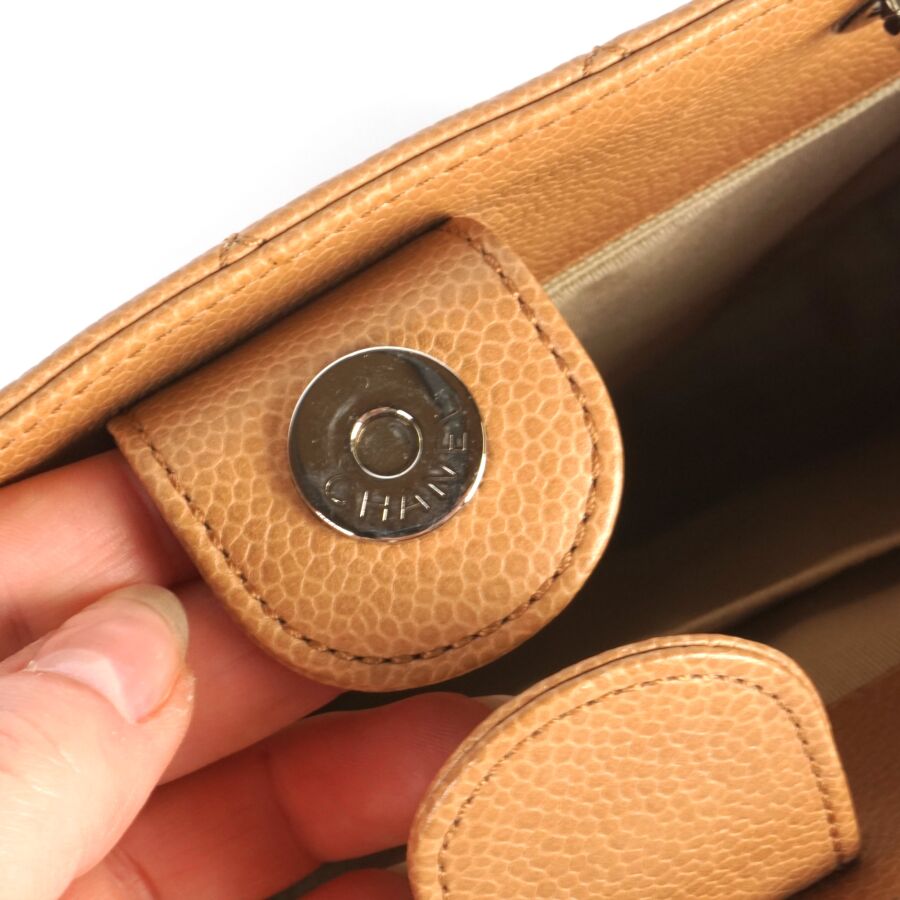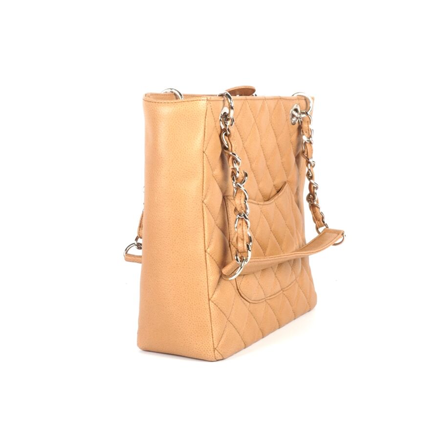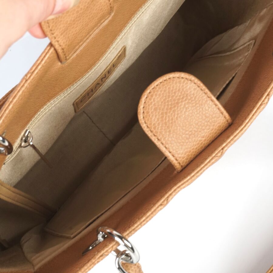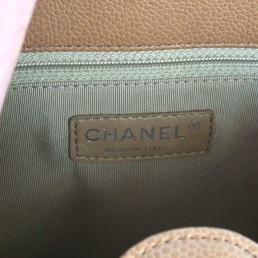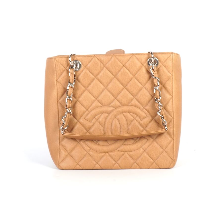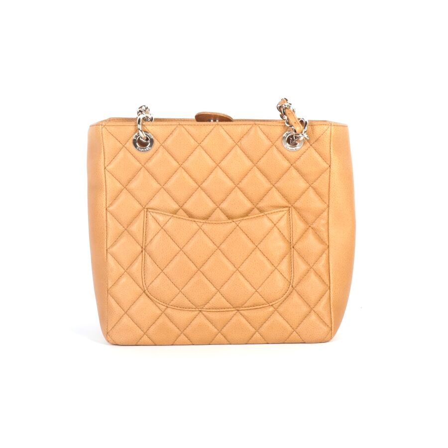 CHANEL : Sac en cuir matelassé marron clair à motif logoté du double "C" sur une face, bijouterie en métal argenté, petite poche extérieure sur l'autre face, deux anses en cuir et métal argenté tressé et lanière en cuir pour un porté main et épaule, fermeture aimantée, anneaux logotés, plaque en cuir signée sur la pochette interne, intérieure beige avec une pochette zippée et une attache à crochet, Dim Hors anses : 23.8 x 25 x 9 cm (très bel état, sans dustbag, ni boîte).