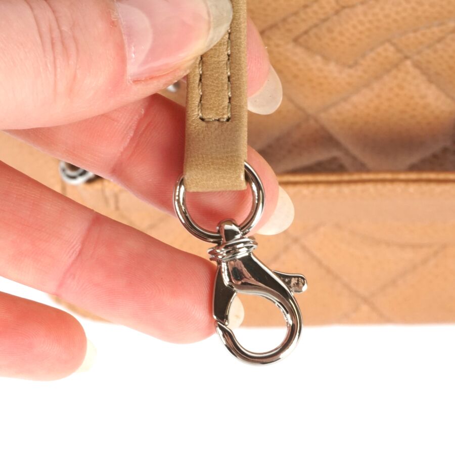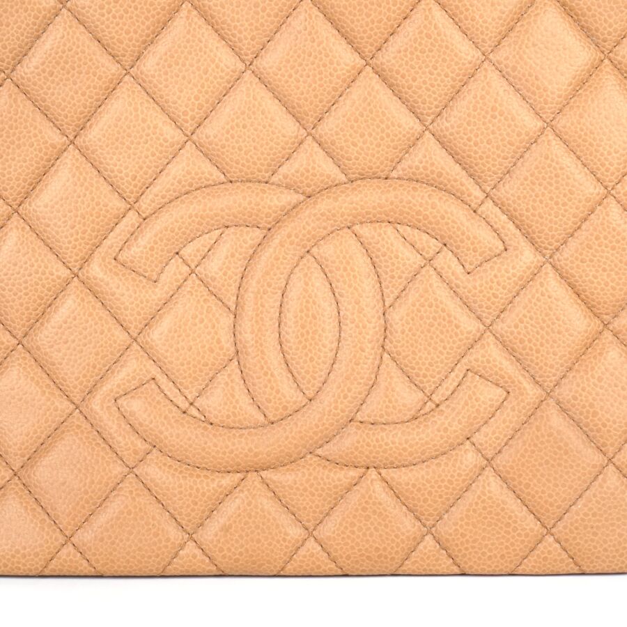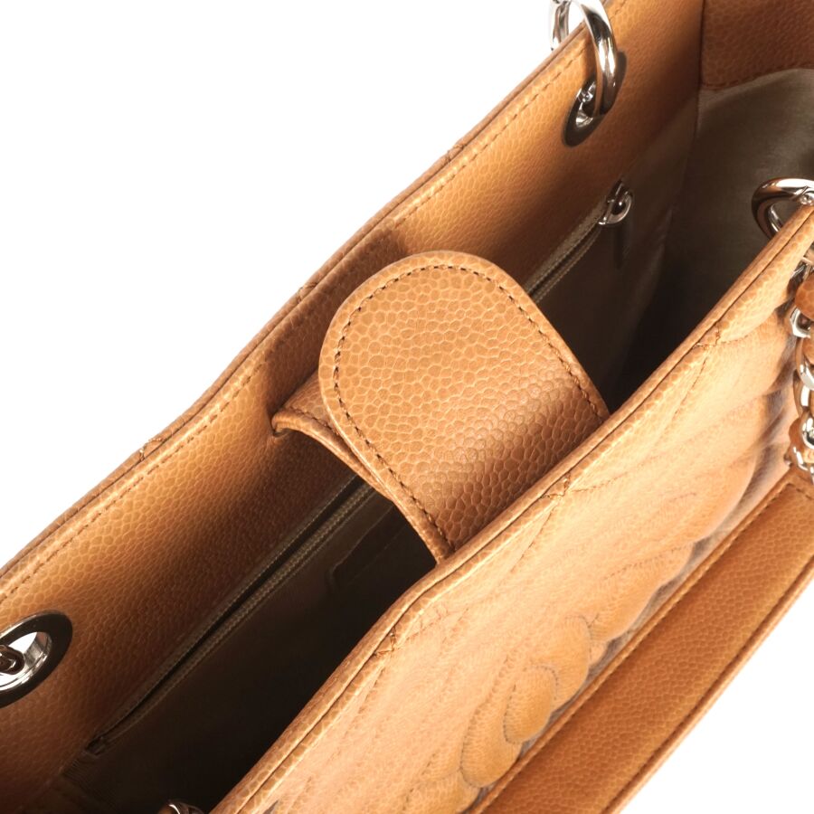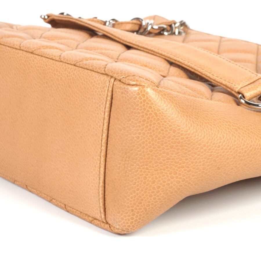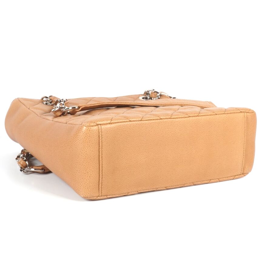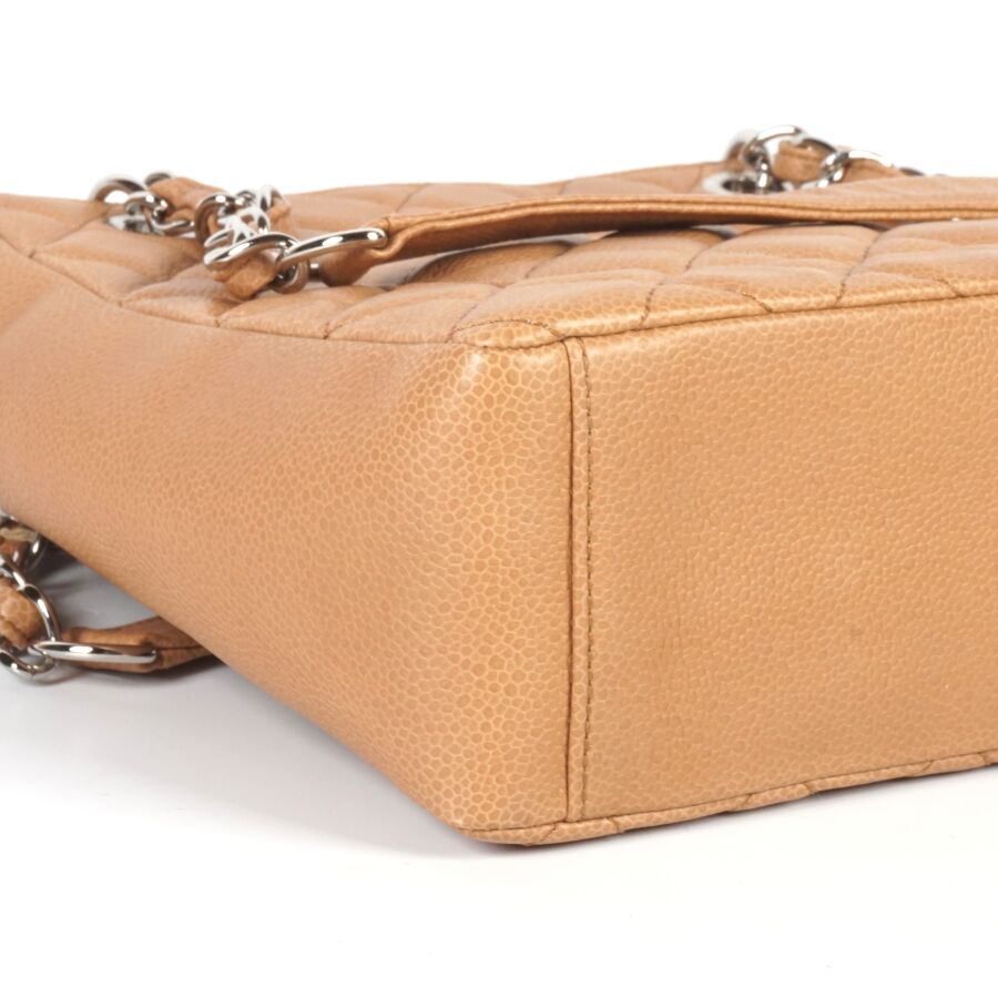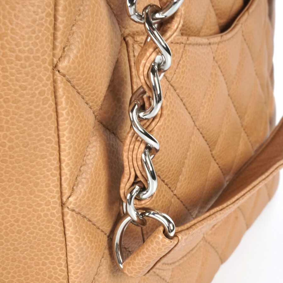 CHANEL : Sac en cuir matelassé marron clair à motif logoté du double "C" sur une face, bijouterie en métal argenté, petite poche extérieure sur l'autre face, deux anses en cuir et métal argenté tressé et lanière en cuir pour un porté main et épaule, fermeture aimantée, anneaux logotés, plaque en cuir signée sur la pochette interne, intérieure beige avec une pochette zippée et une attache à crochet, Dim Hors anses : 23.8 x 25 x 9 cm (très bel état, sans dustbag, ni boîte).